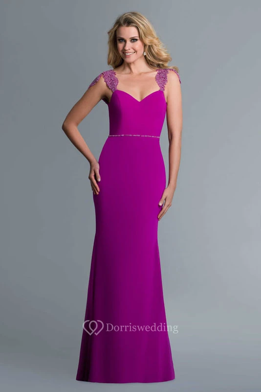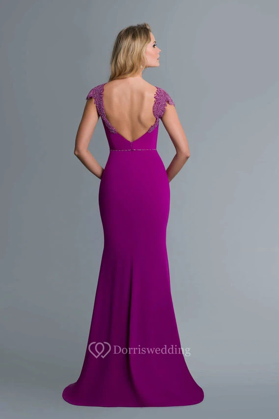 Sheath Long Cap-Sleeve Jersey Deep-V Back Dress