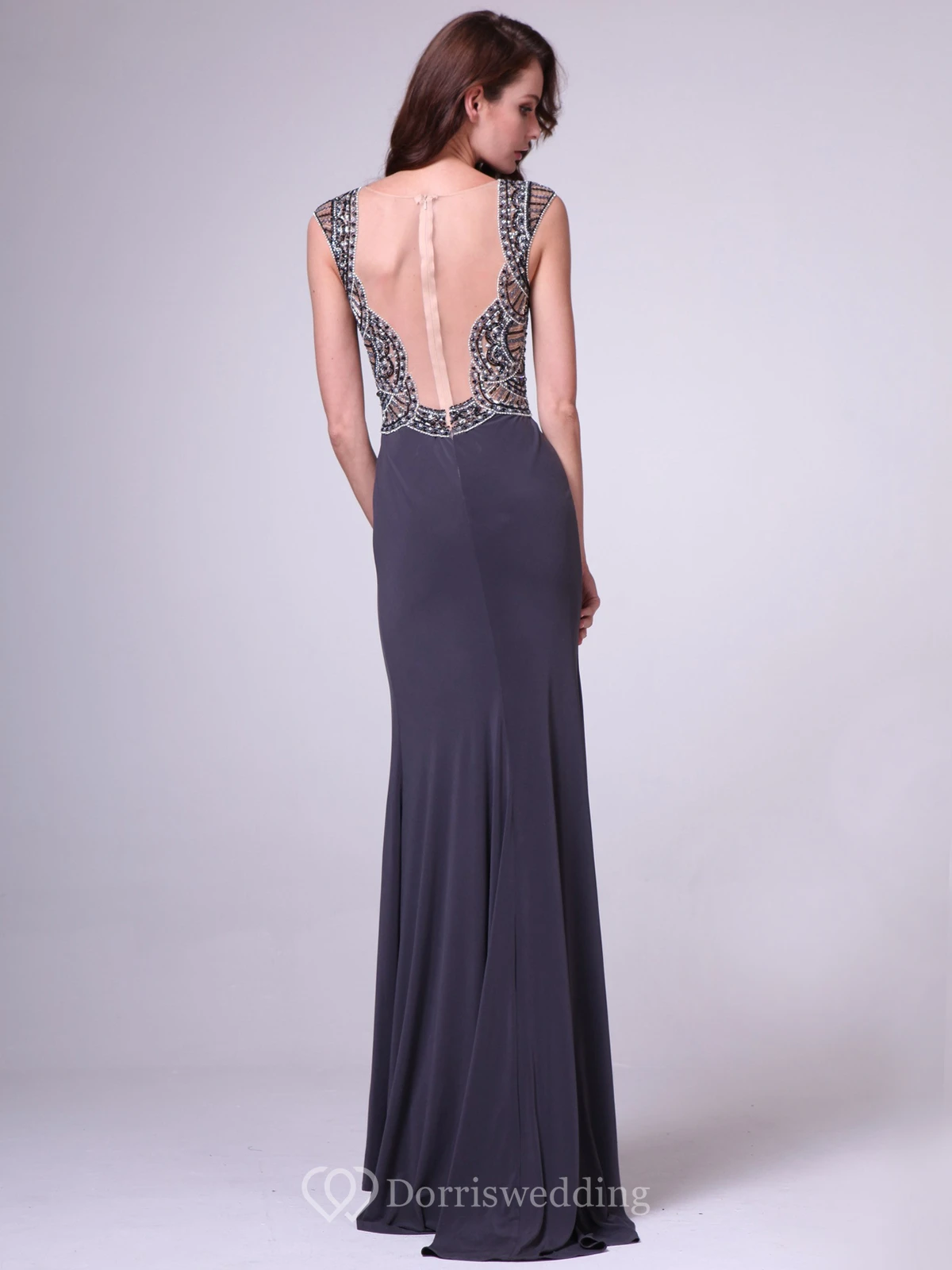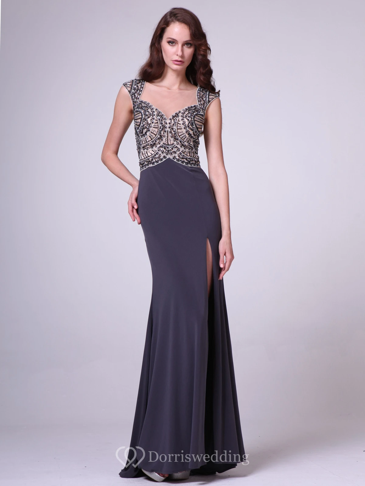Sheath Long Cap-Sleeve Jersey Illusion Dress With Beading And Split Front