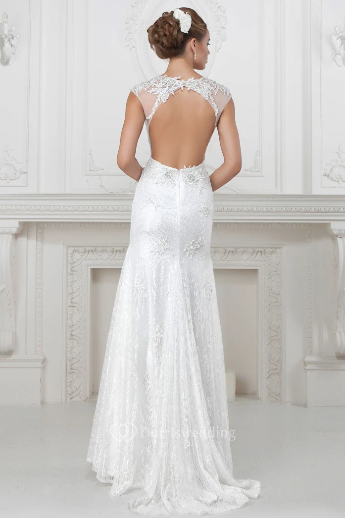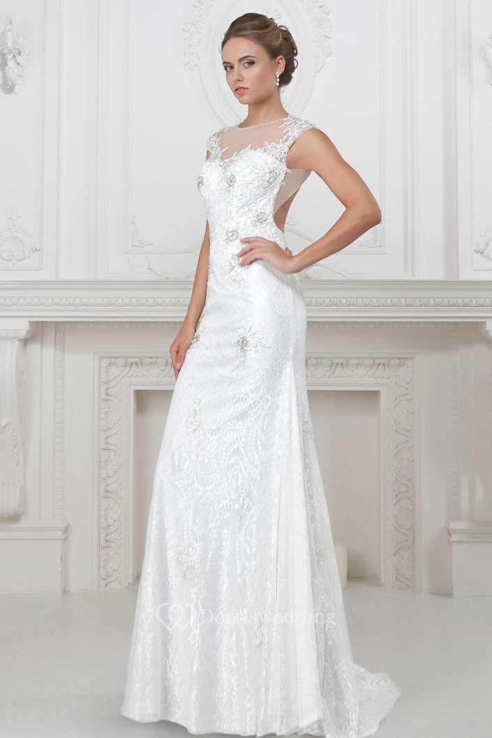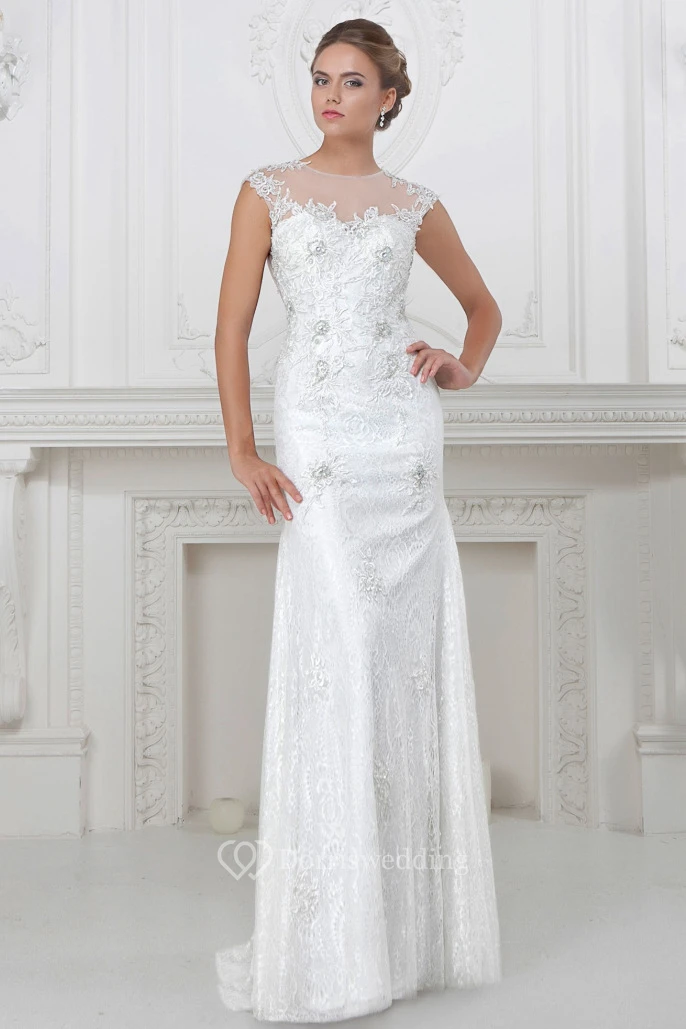 Sheath Long Cap-Sleeve Jewel-Neck Appliqued Lace Wedding Dress With Beading