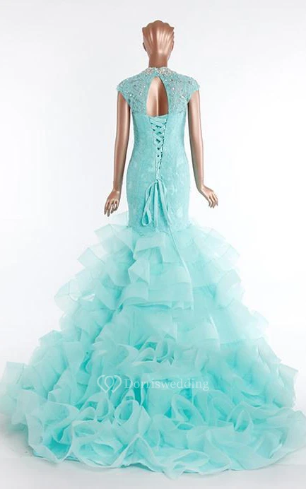 Sheath Long High Neck Bell Cap Beading Embroidery Ruffles Court Train Lace-Up Back Tulle Lace Dress