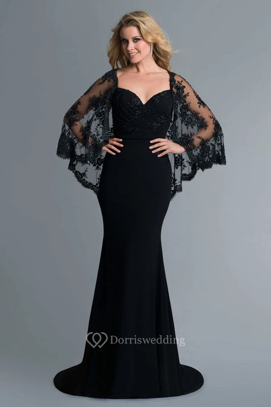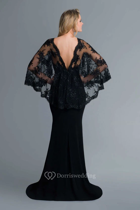 Sheath Long Jersey Deep-V Back Dress With Lace And Cape