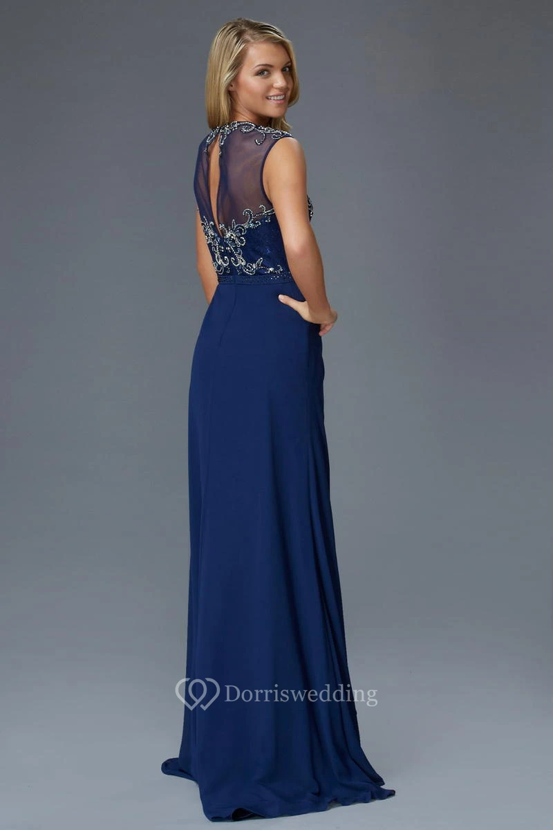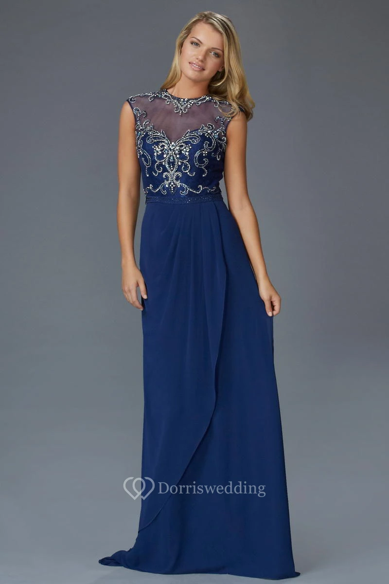 Sheath Long Jewel-Neck Cap-Sleeve Jersey Illusion Dress With Beading