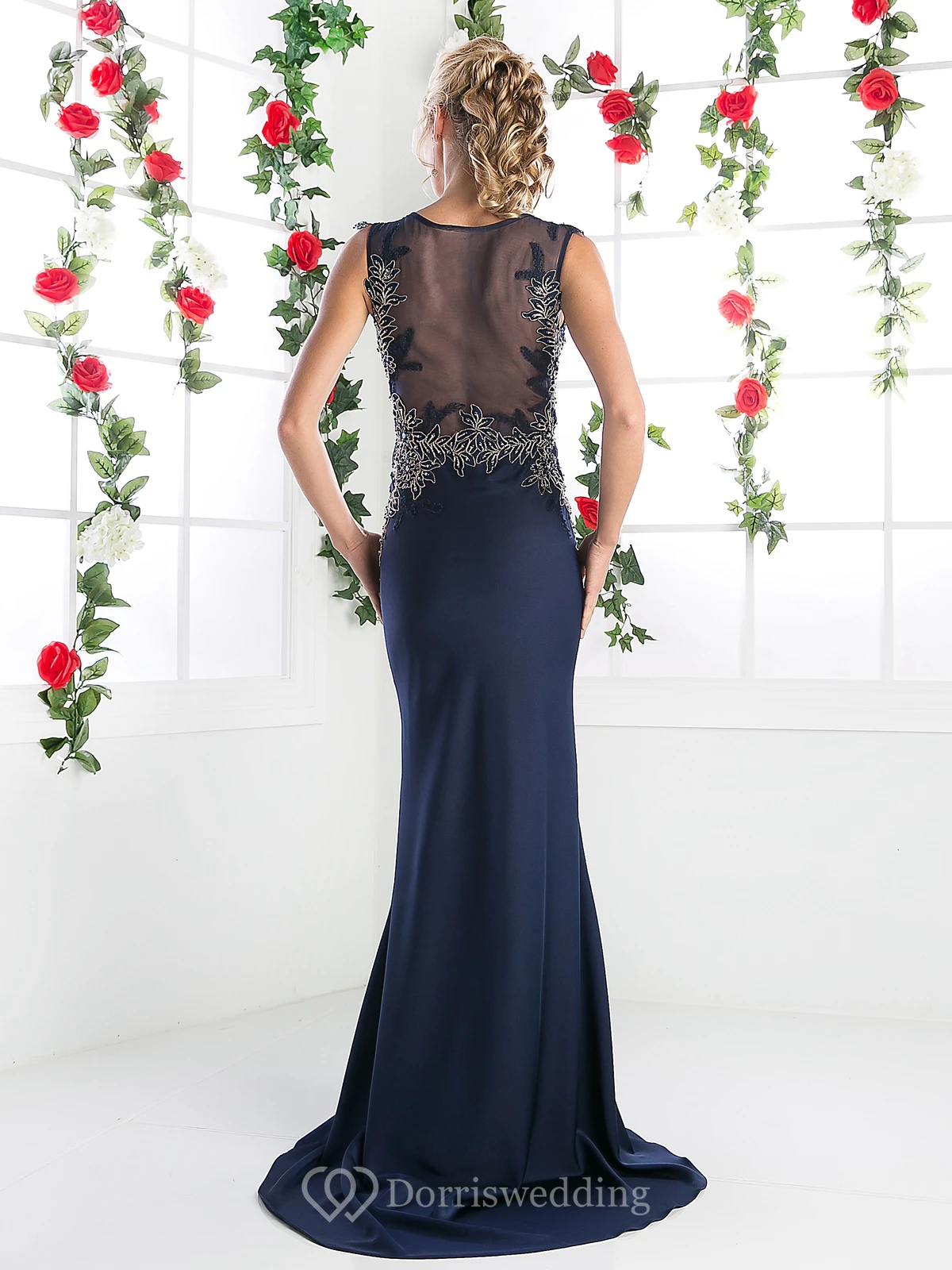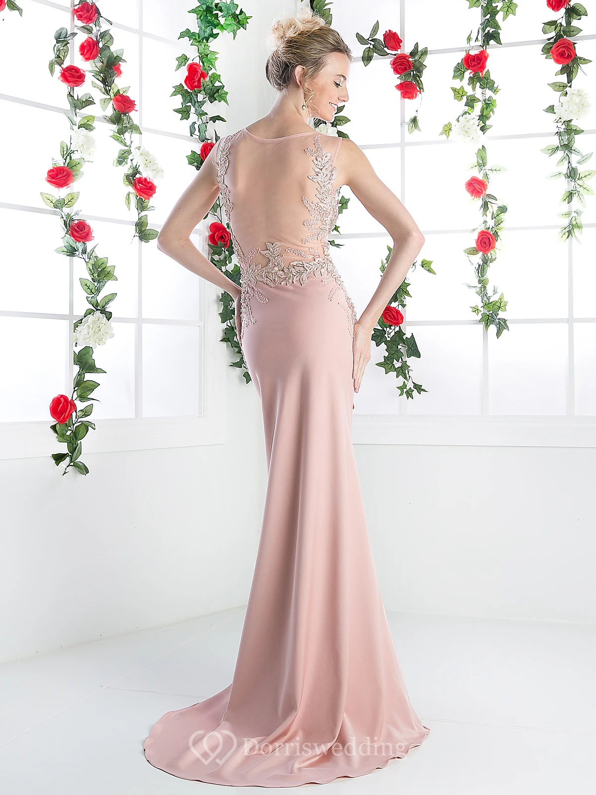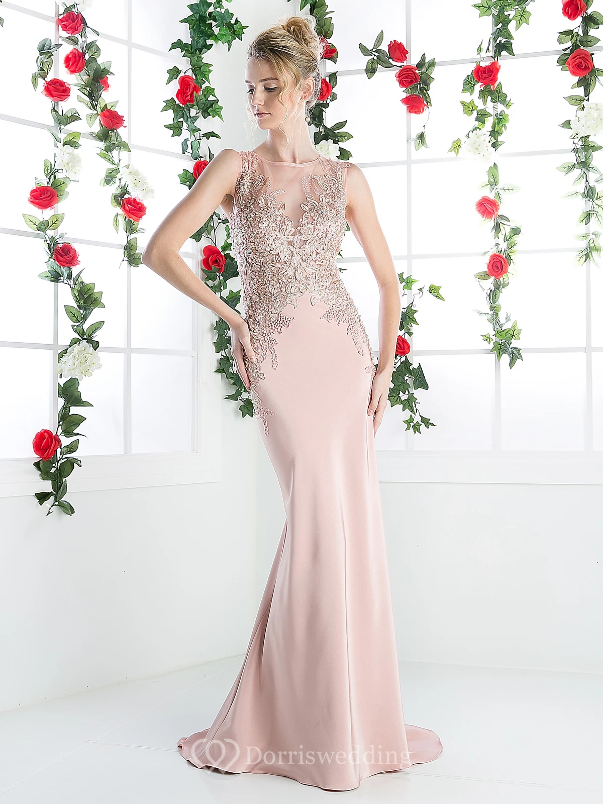 Sheath Long Jewel-Neck Sleeveless Jersey Illusion Dress With Appliques