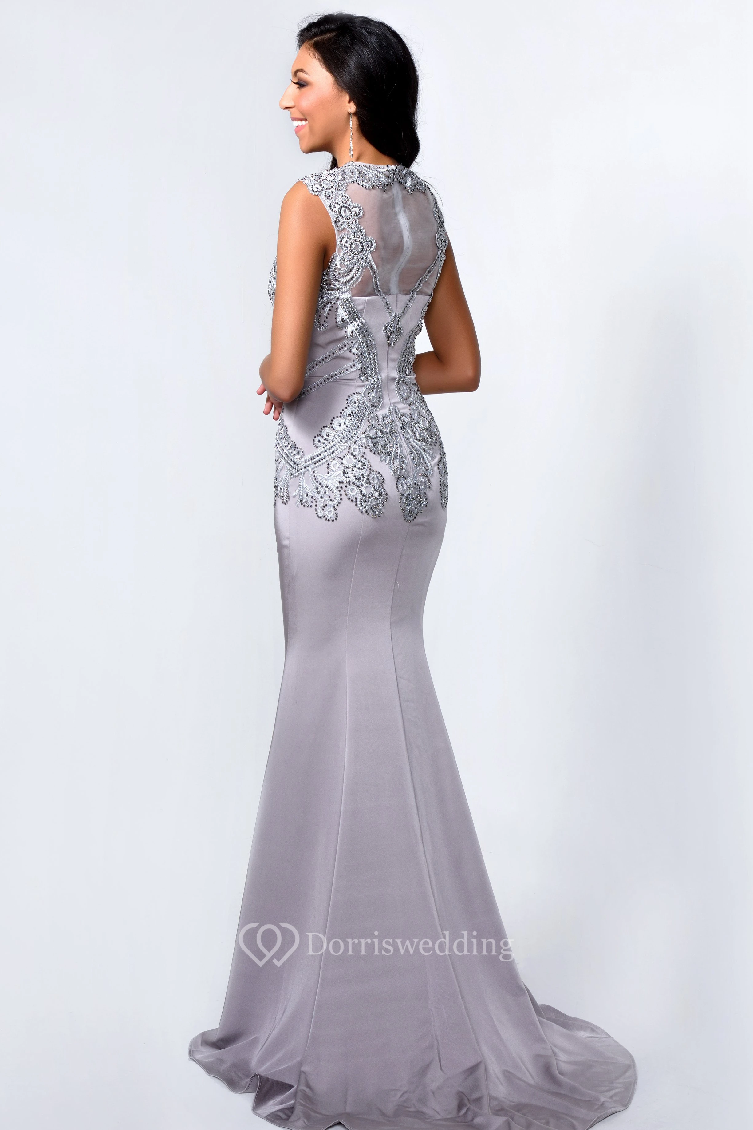 Sheath Long Jewel-Neck Sleeveless Jersey Illusion Dress With Beading