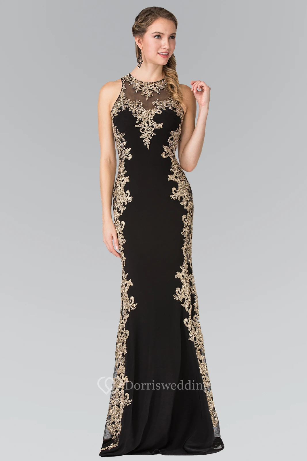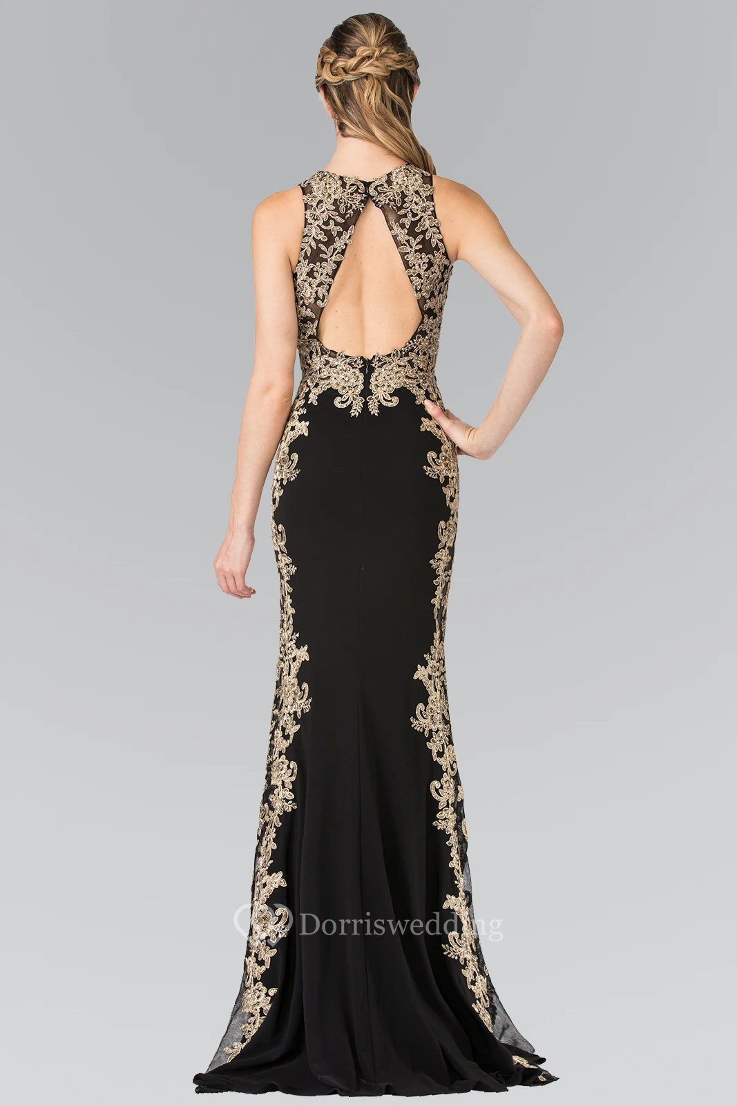 Sheath Long Jewel-Neck Sleeveless Jersey Keyhole Dress With Appliques