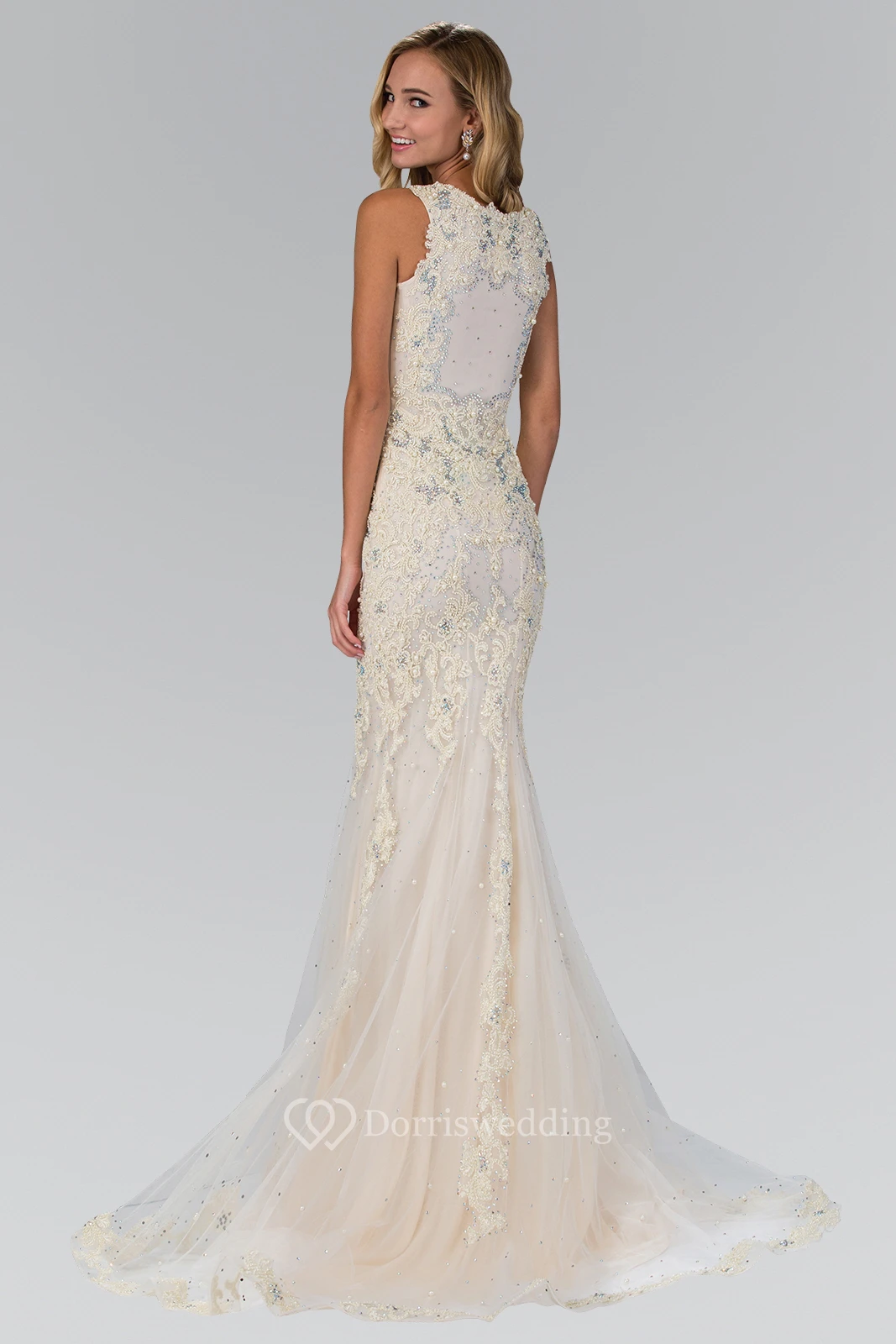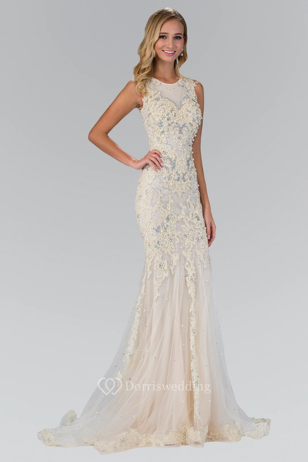Sheath Long Jewel-Neck Sleeveless Tulle Dress With Beading And Appliques