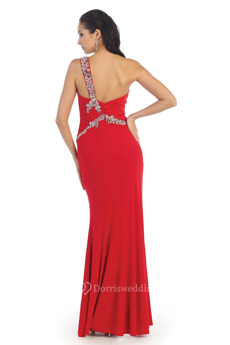 Sheath Long One-Shoulder Sleeveless Jersey Dress With Split Front And Beading