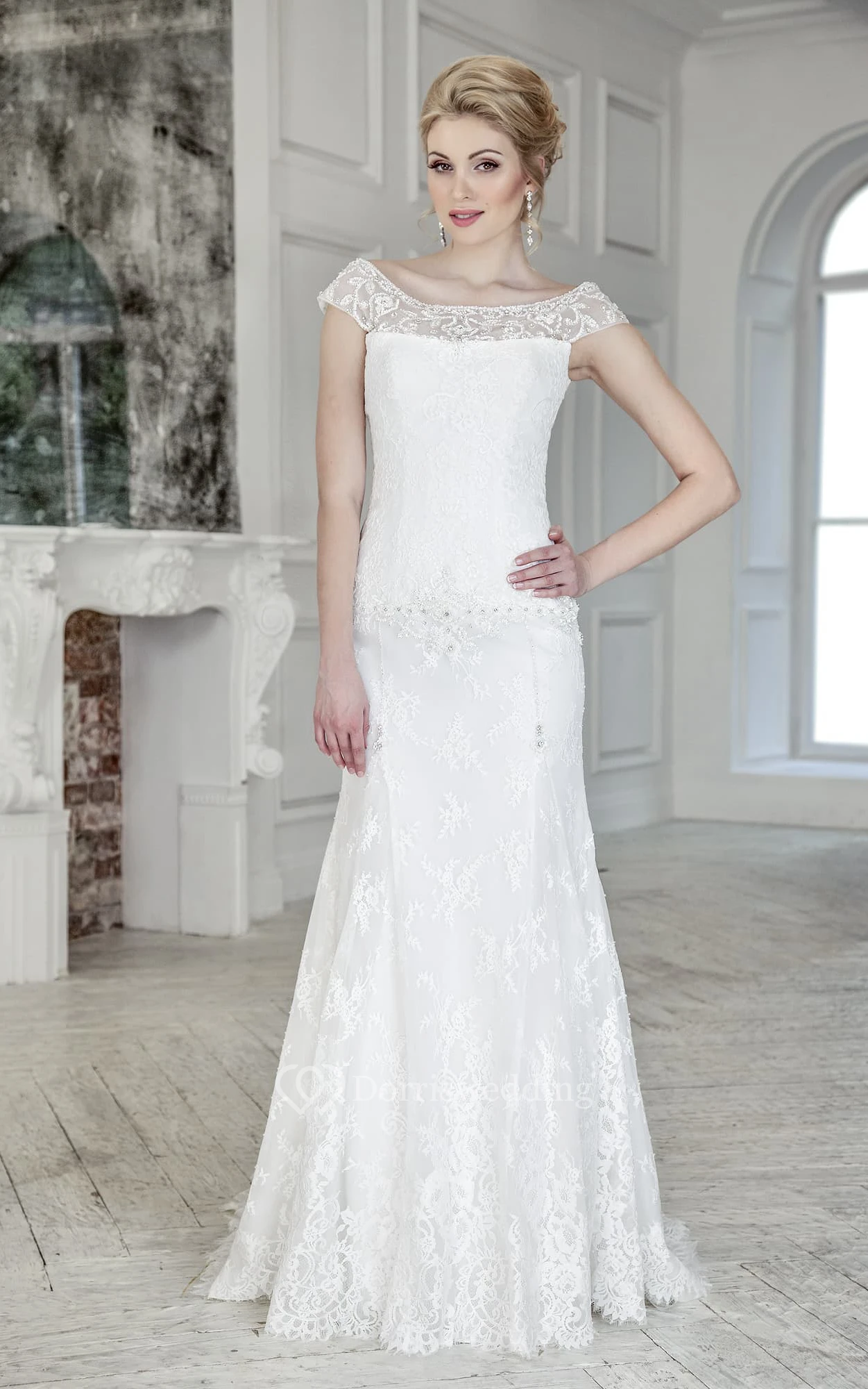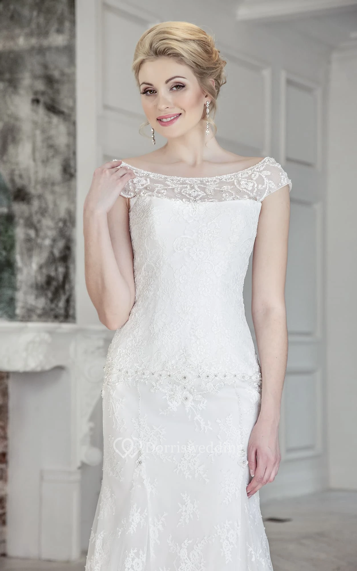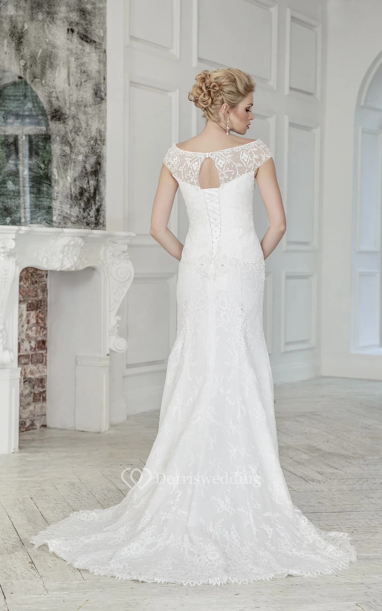 Sheath Long Scoop Cap-Sleeve Corset-Back Lace Dress With Beading