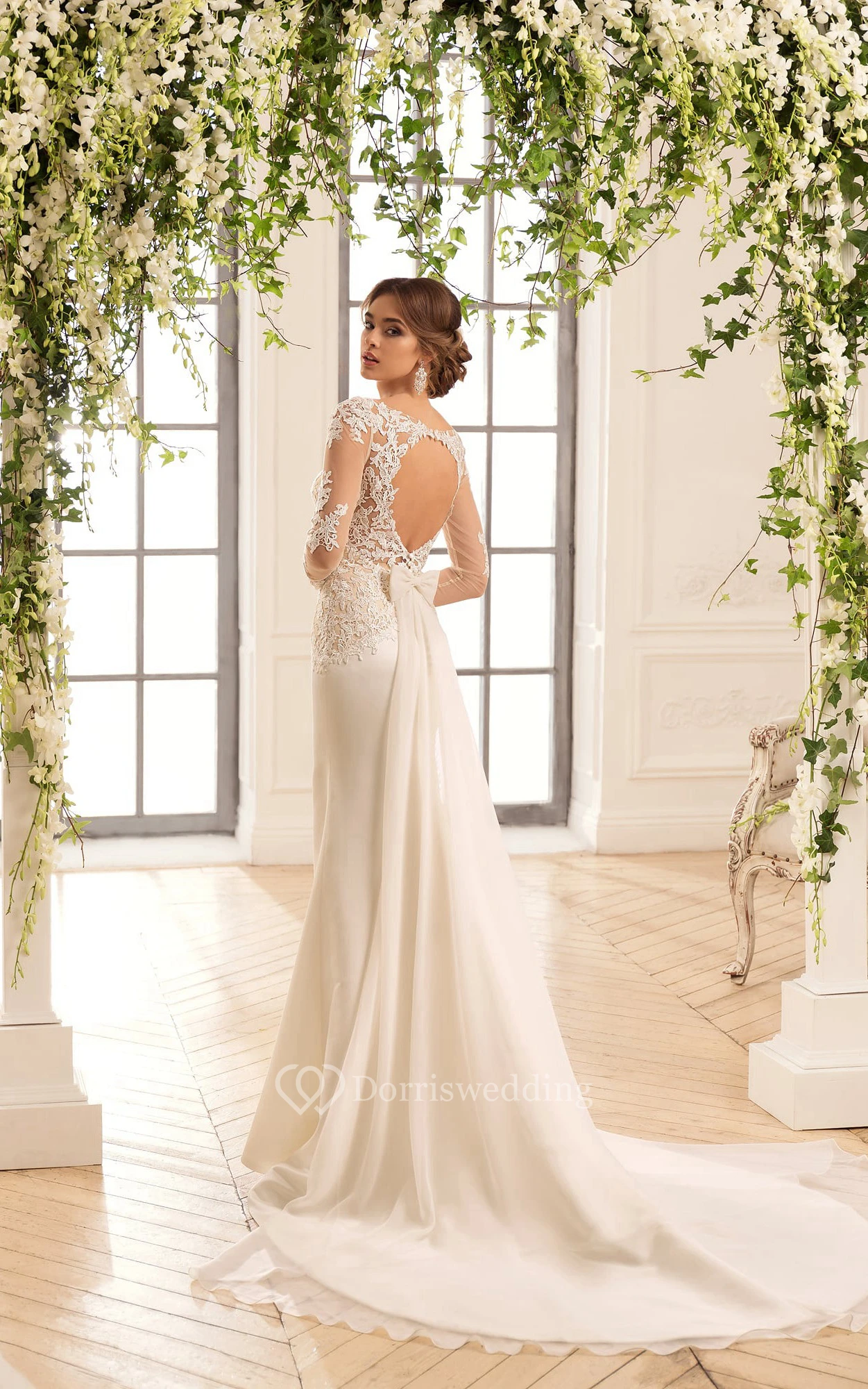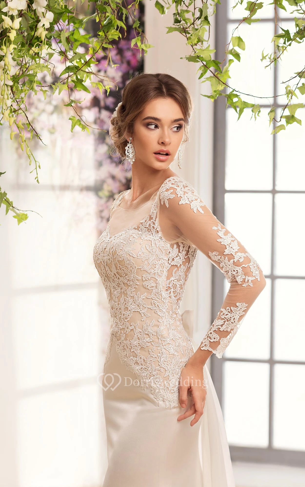 Sheath Long Scoop Illusion-Sleeve Keyhole Lace Satin Dress With Bow
