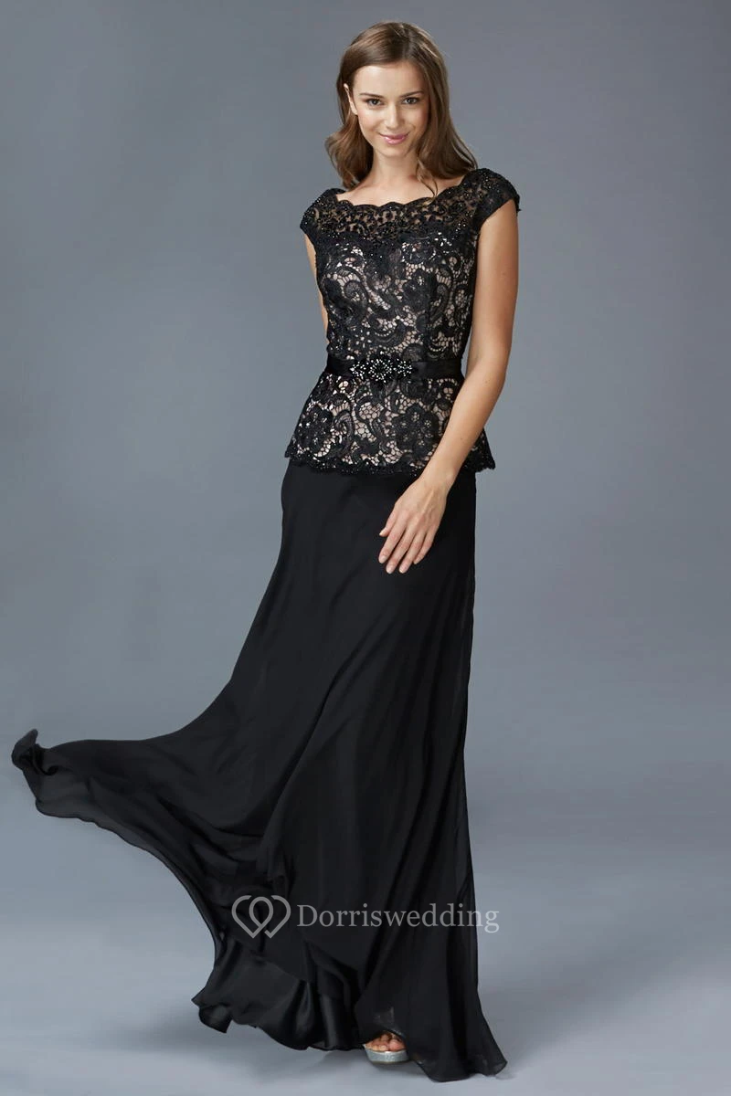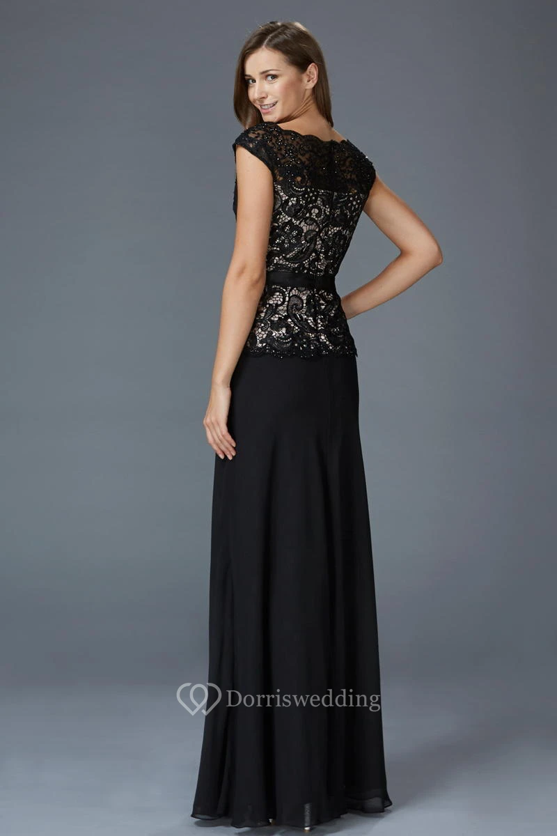 Sheath Long Scoop-Neck Cap-Sleeve Chiffon Zipper Dress With Lace And Appliques