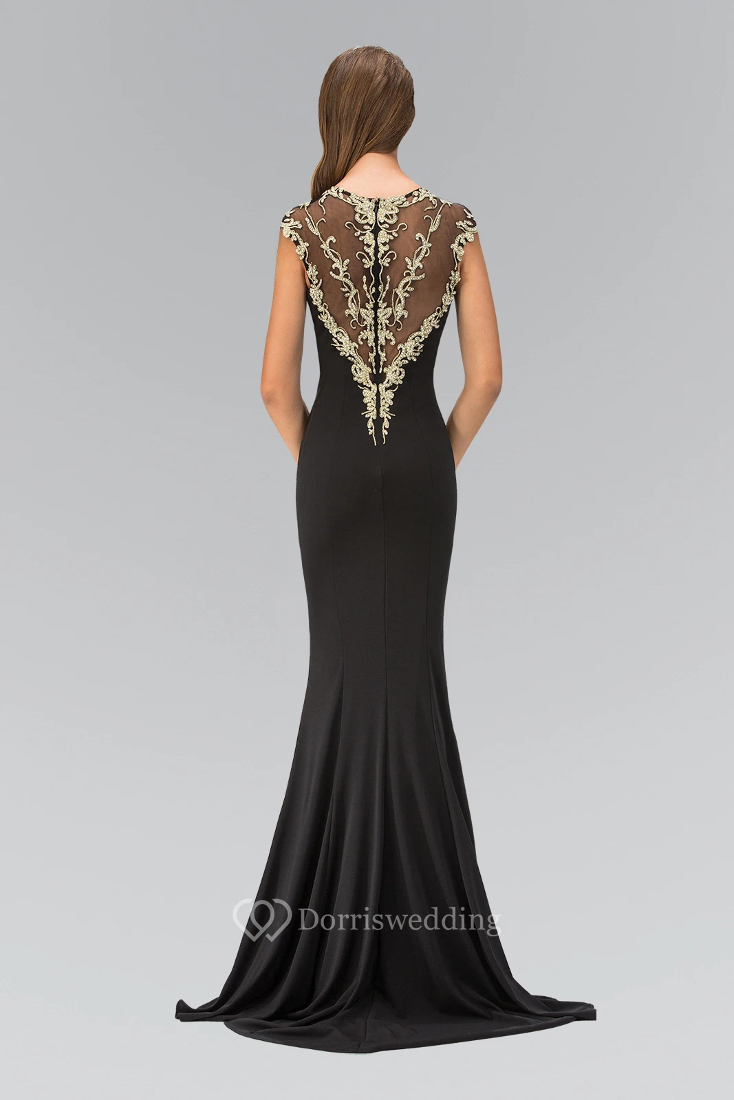 Sheath Long Scoop-Neck Cap-Sleeve Jersey Illusion Dress With Beading