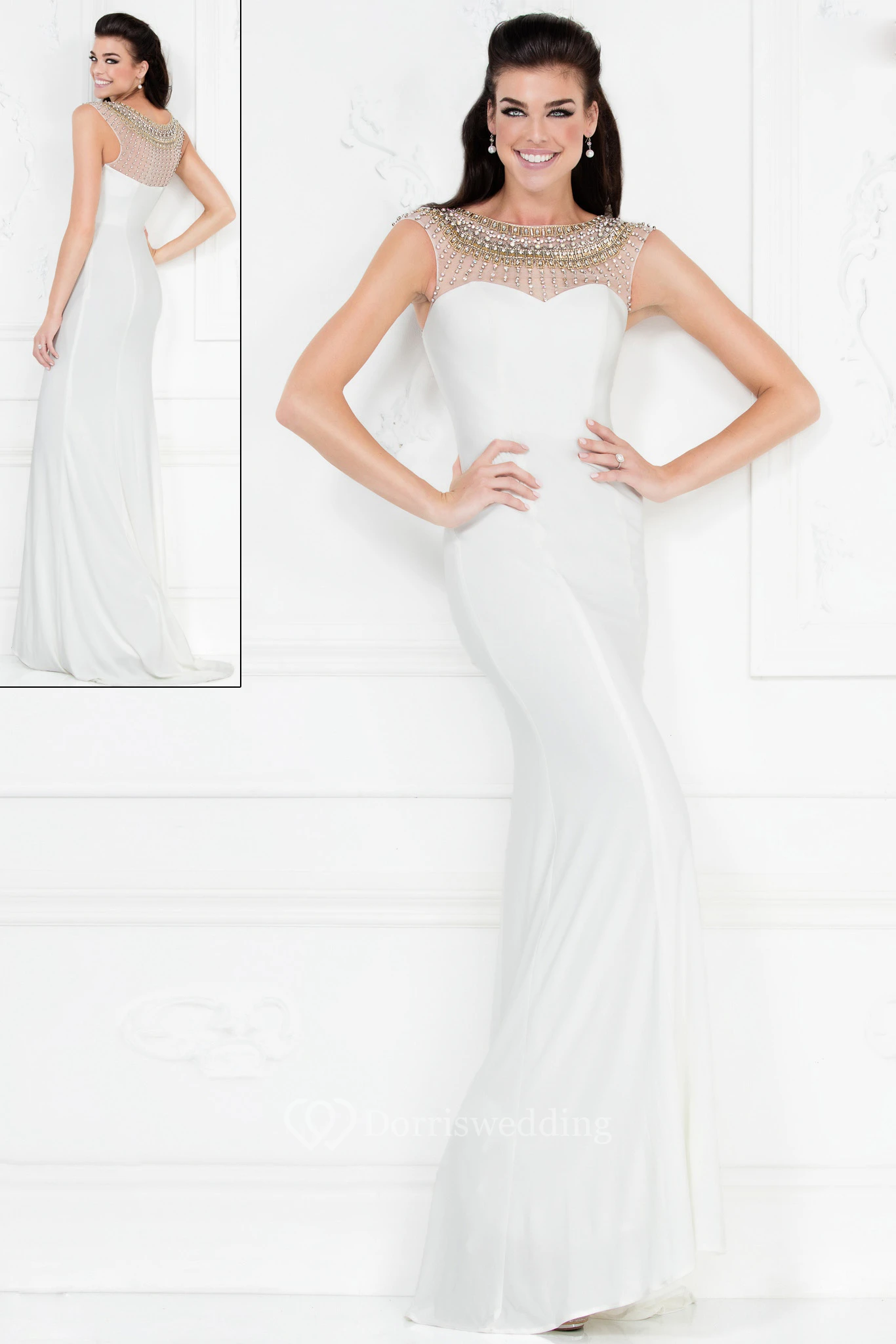 Sheath Long Scoop-Neck Cap-Sleeve Jersey Illusion Dress With Beading