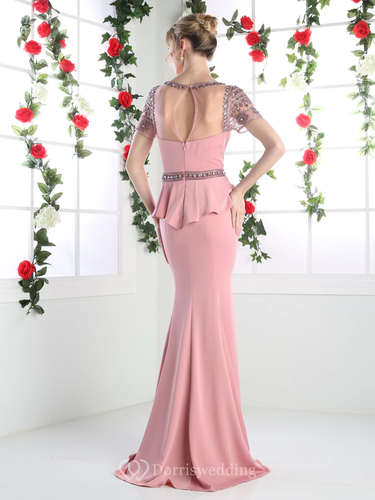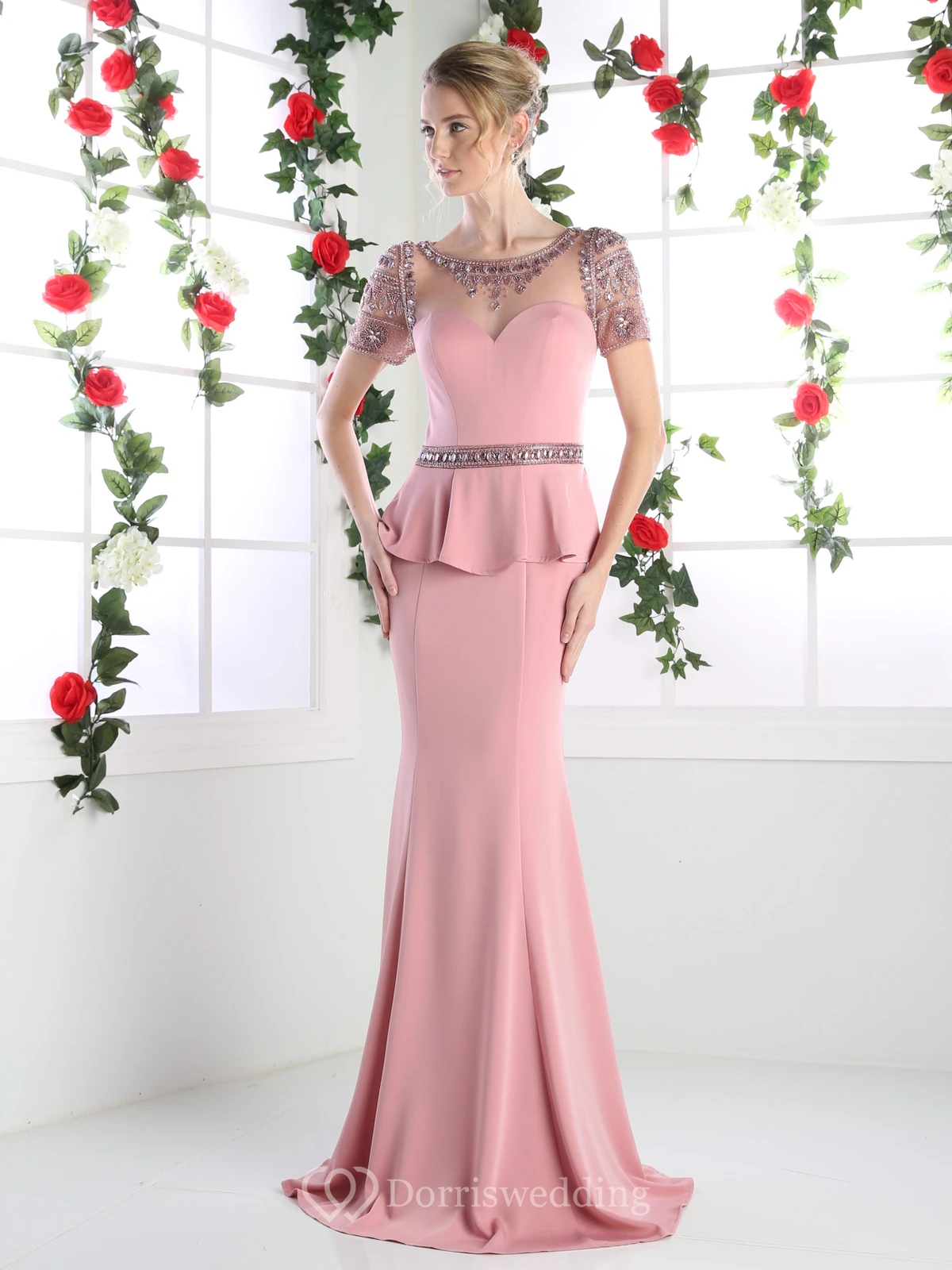 Sheath Long Scoop-Neck Short Sleeve Jersey Illusion Dress With Peplum And Beading