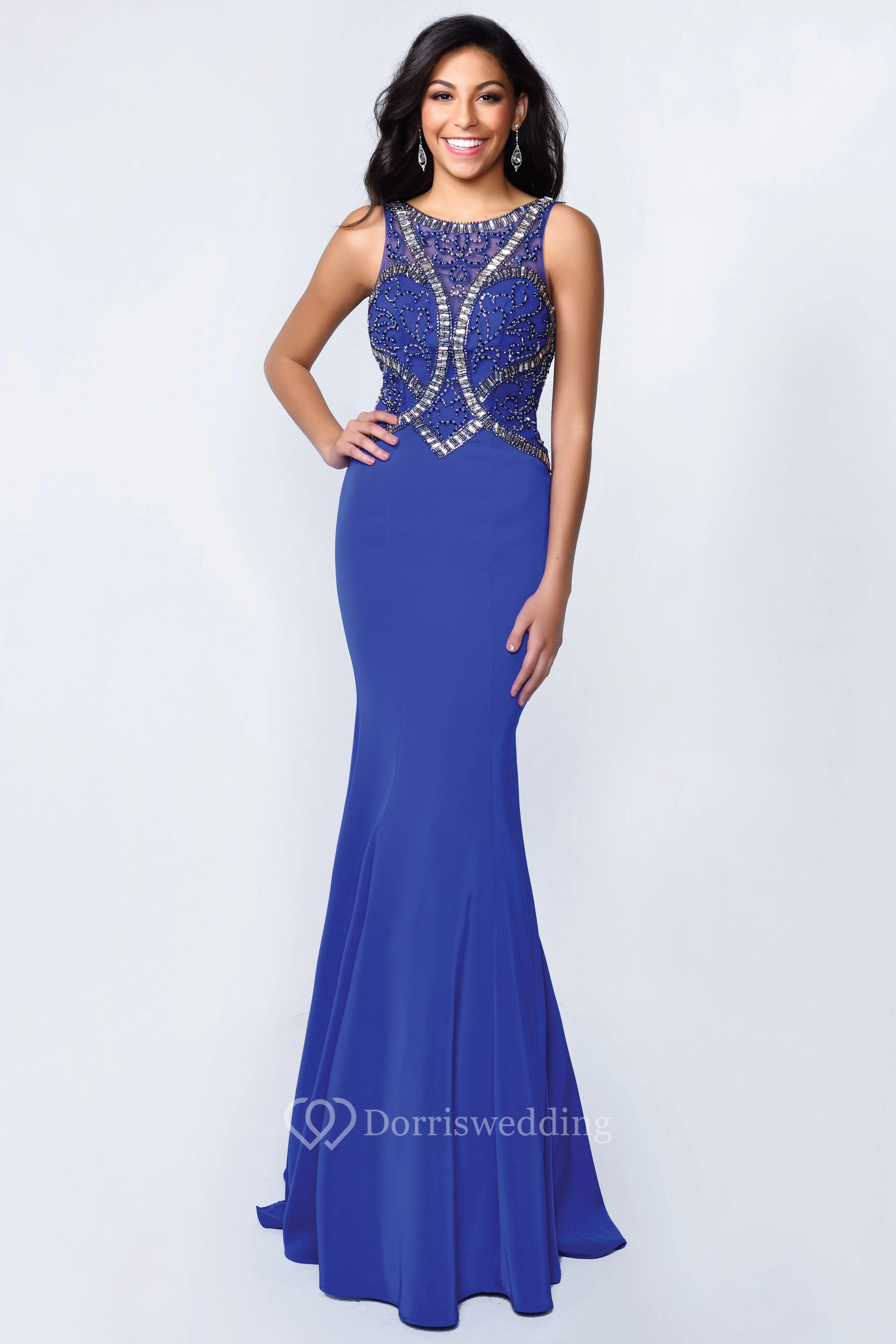 Sheath Long Scoop-Neck Sleeveless Jersey Deep-V Back Dress With Beading