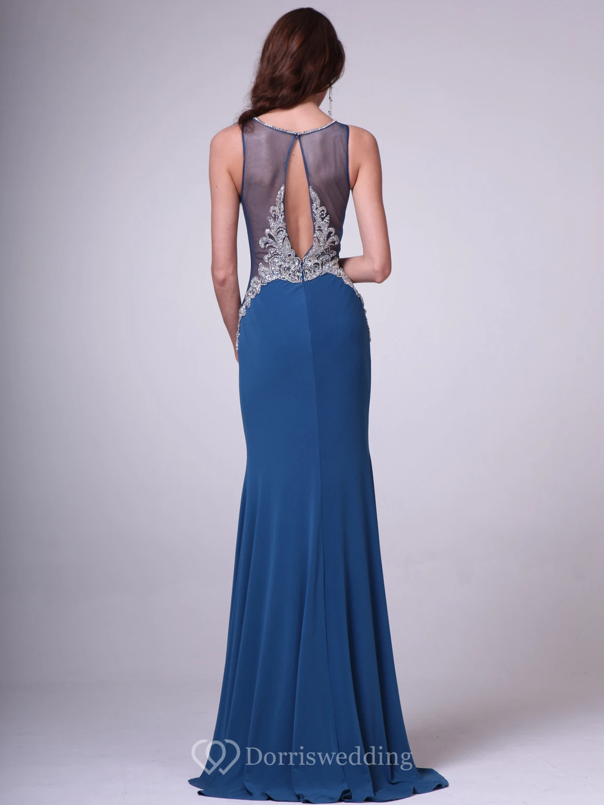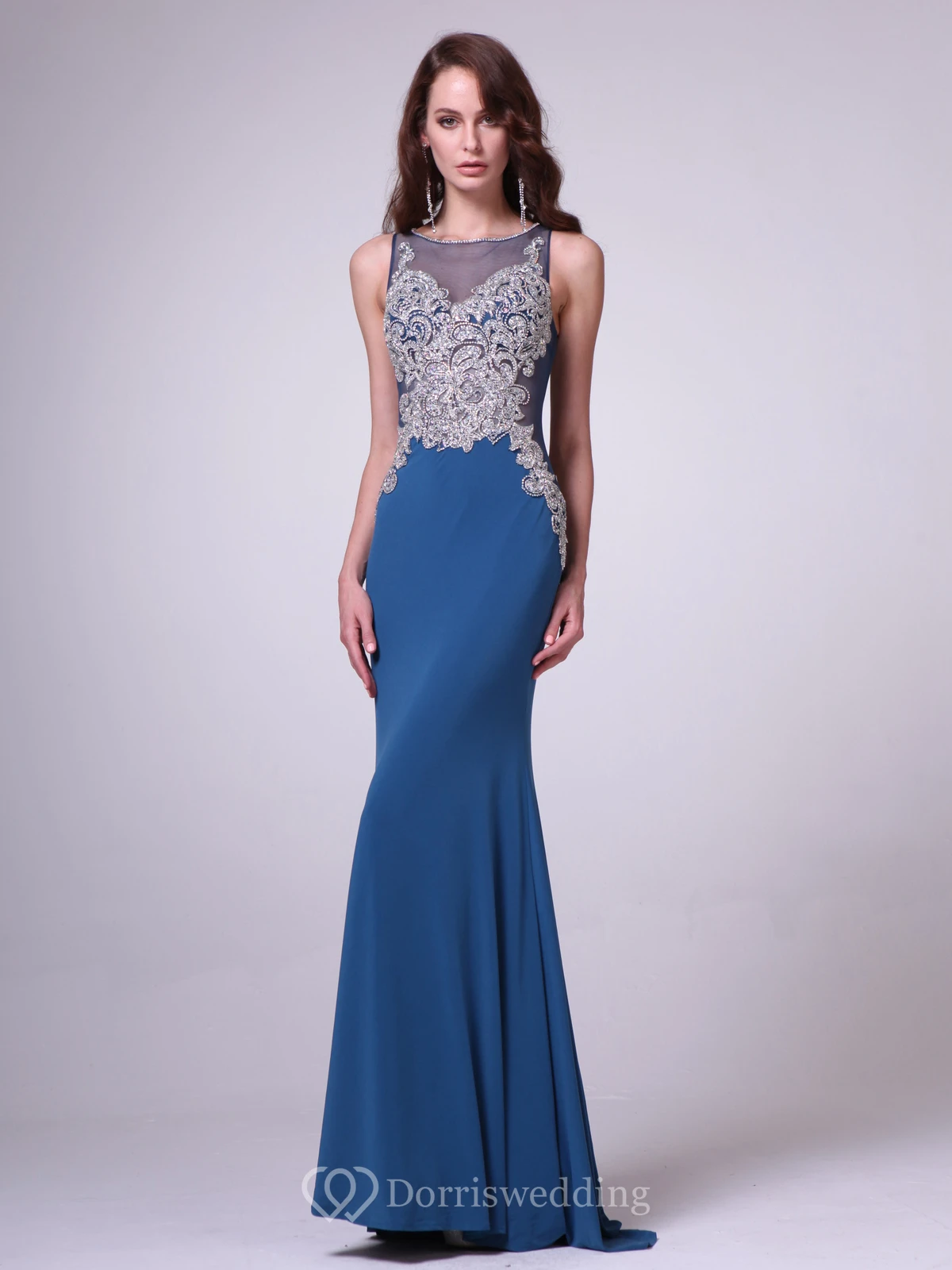 Sheath Long Scoop-Neck Sleeveless Jersey Illusion Dress With Beading And Pleats