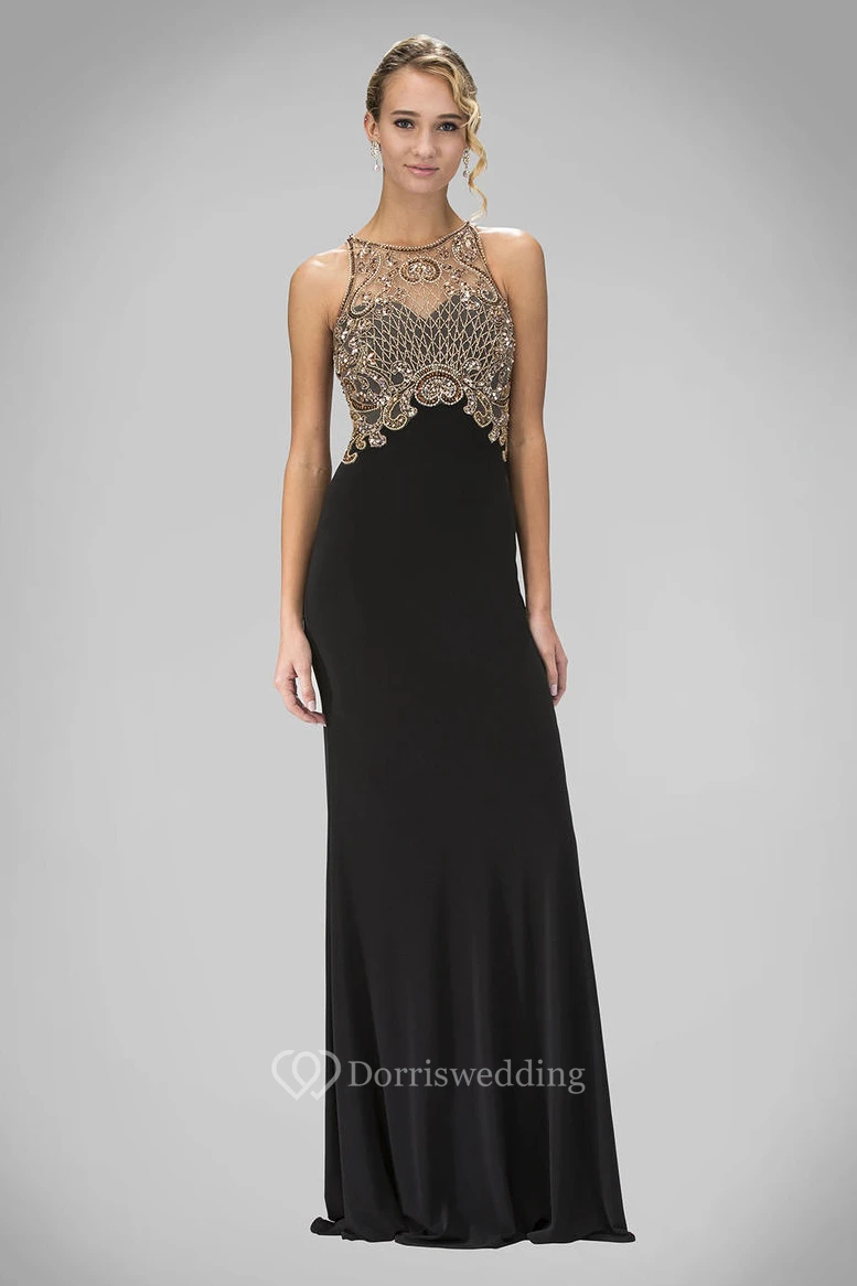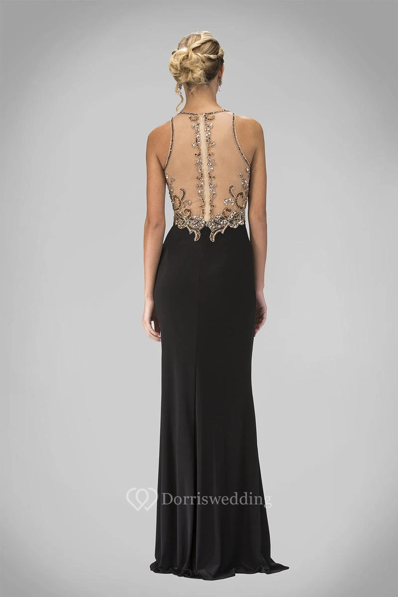 Sheath Long Scoop-Neck Sleeveless Jersey Illusion Dress With Beading