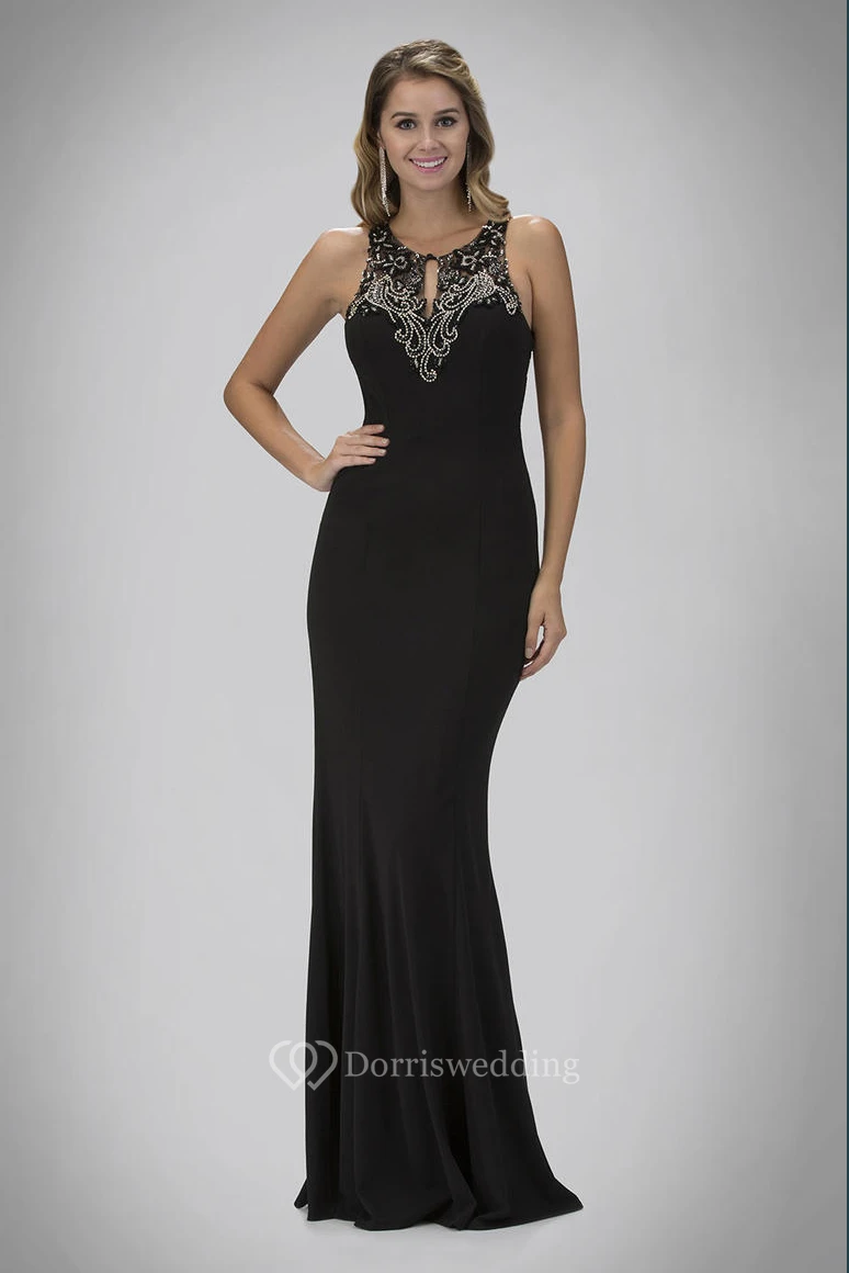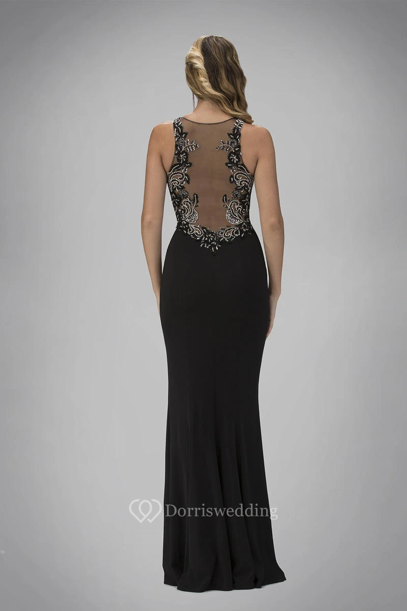 Sheath Long Scoop-Neck Sleeveless Jersey Illusion Dress With Beading