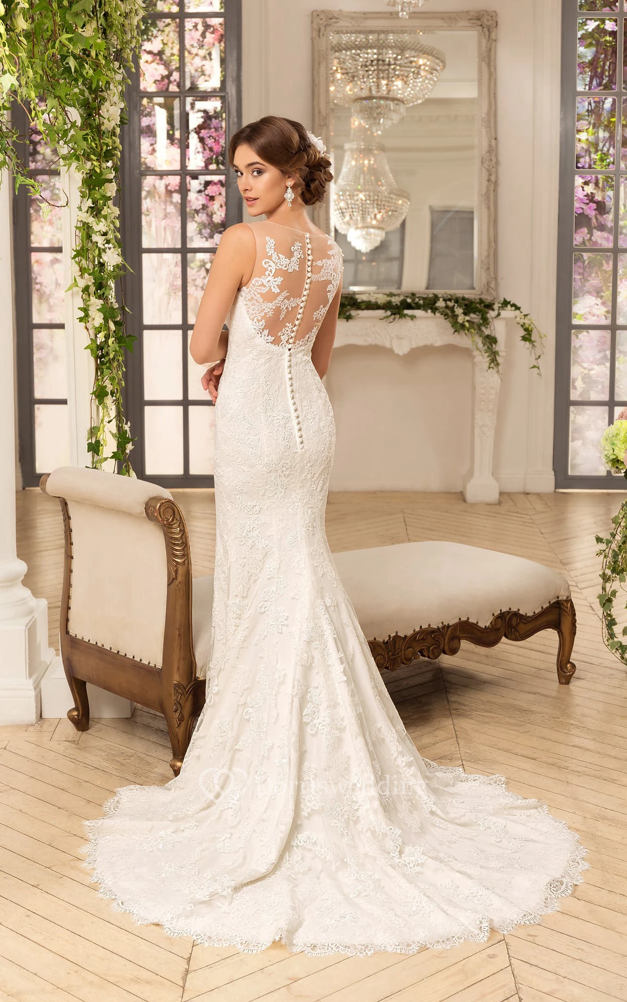 Sheath Long Scoop Sleeveless Illusion Lace Bridal Dress With Appliques