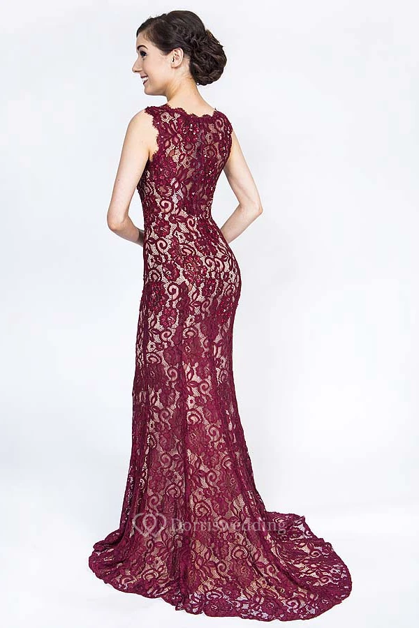 Sheath Long Scoop Sleeveless Lace Prom Dress With Illusion Back And Brush Train