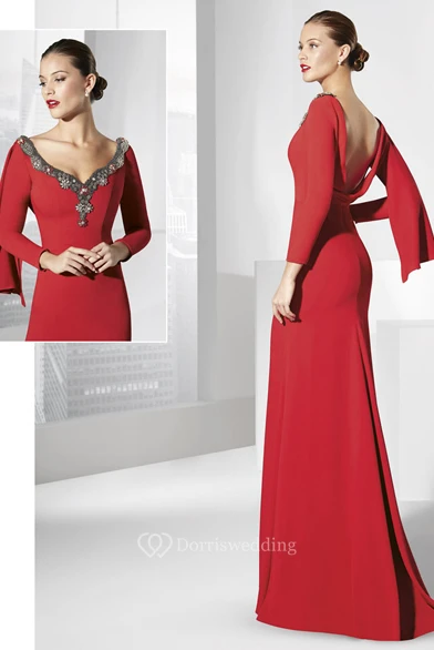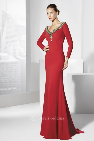 Sheath Long-Sleeve Floor-Length V-Neck Jersey Prom Dress