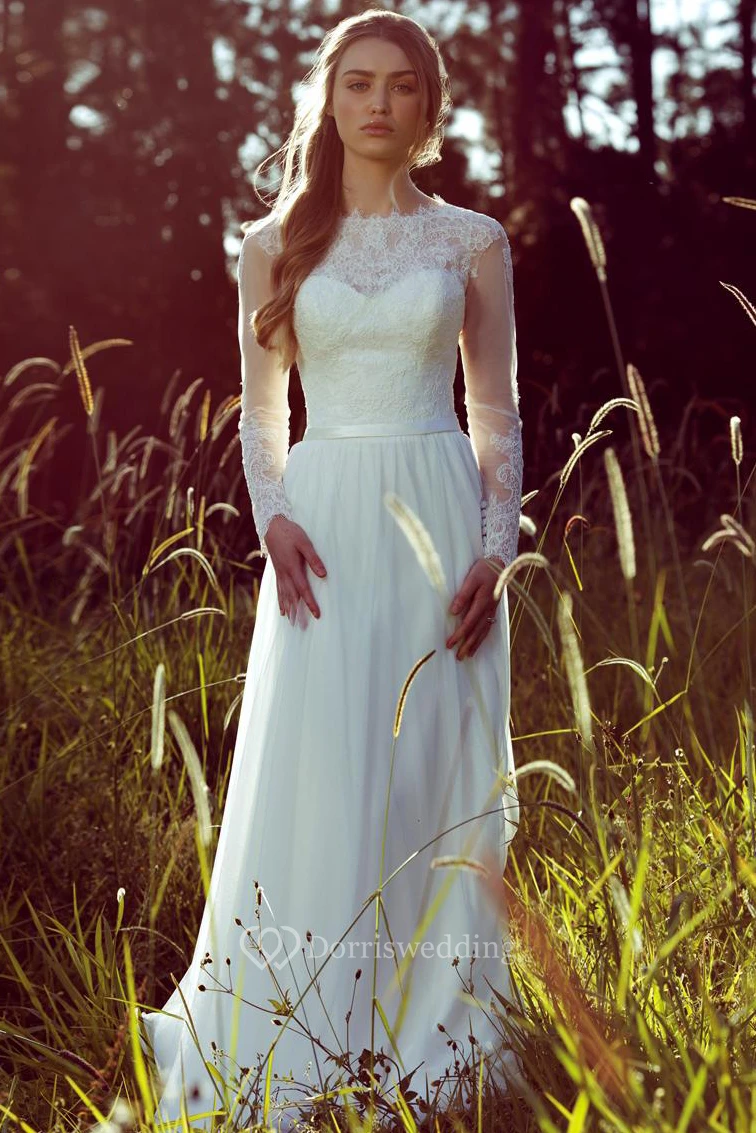 Sheath Long-Sleeve Jewel-Neck Chiffon Wedding Dress With Illusion