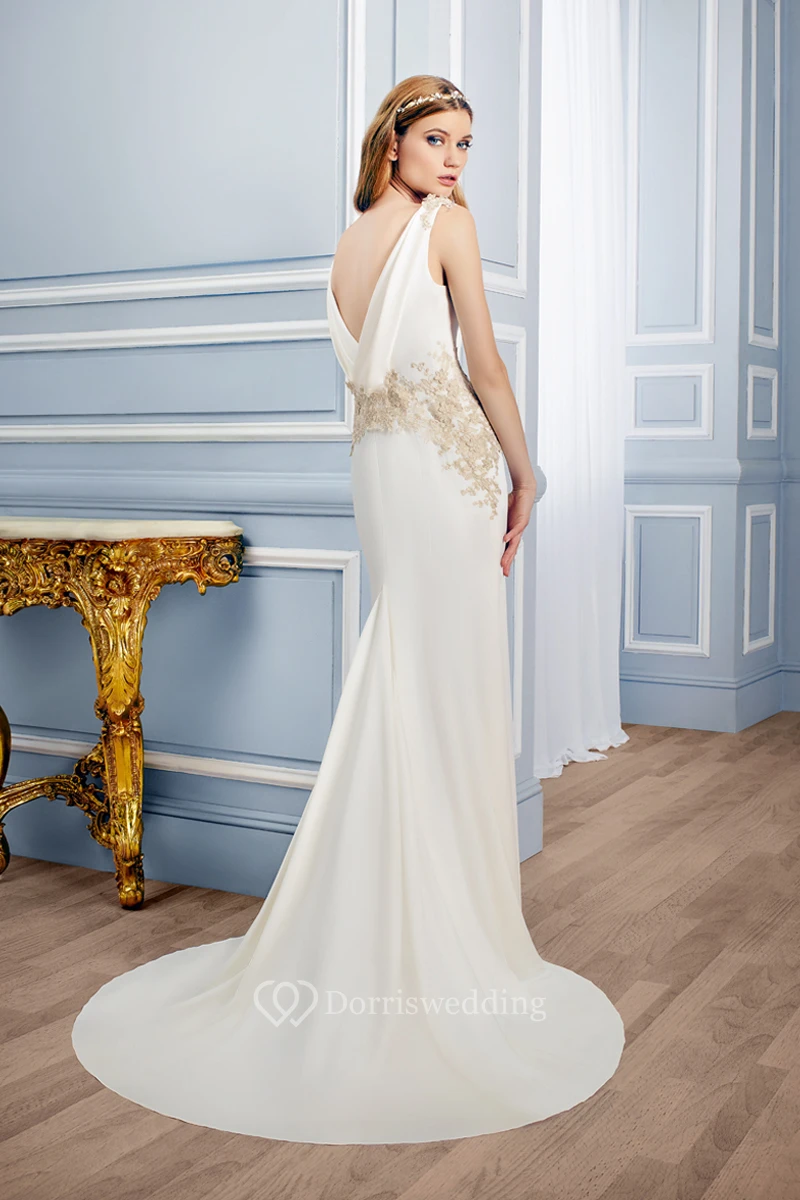 Sheath Long Sleeveless Appliqued Bateau Wedding Dress With Court Train And Low-V Back