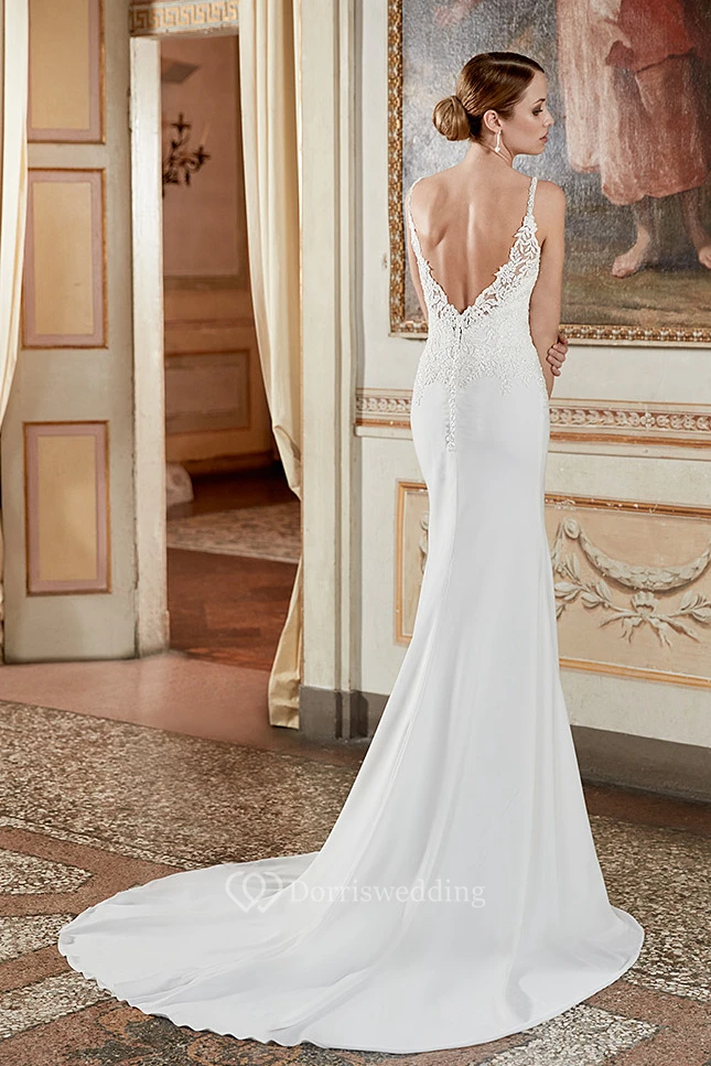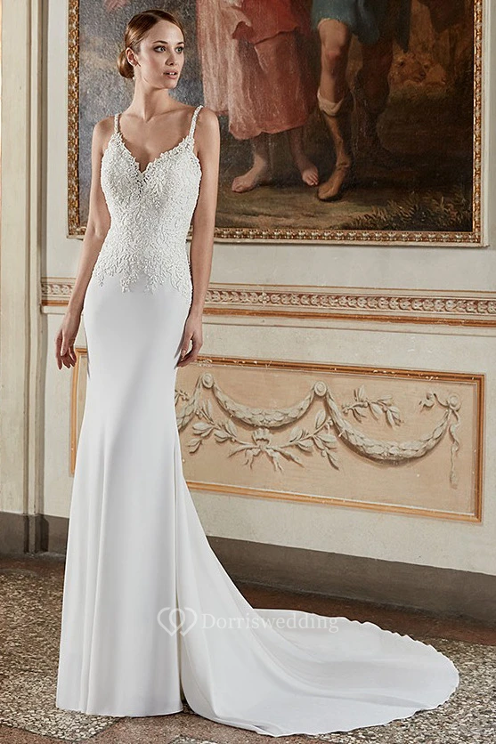 Sheath Long Sleeveless Appliqued Spaghetti Lace&Chiffon Wedding Dress