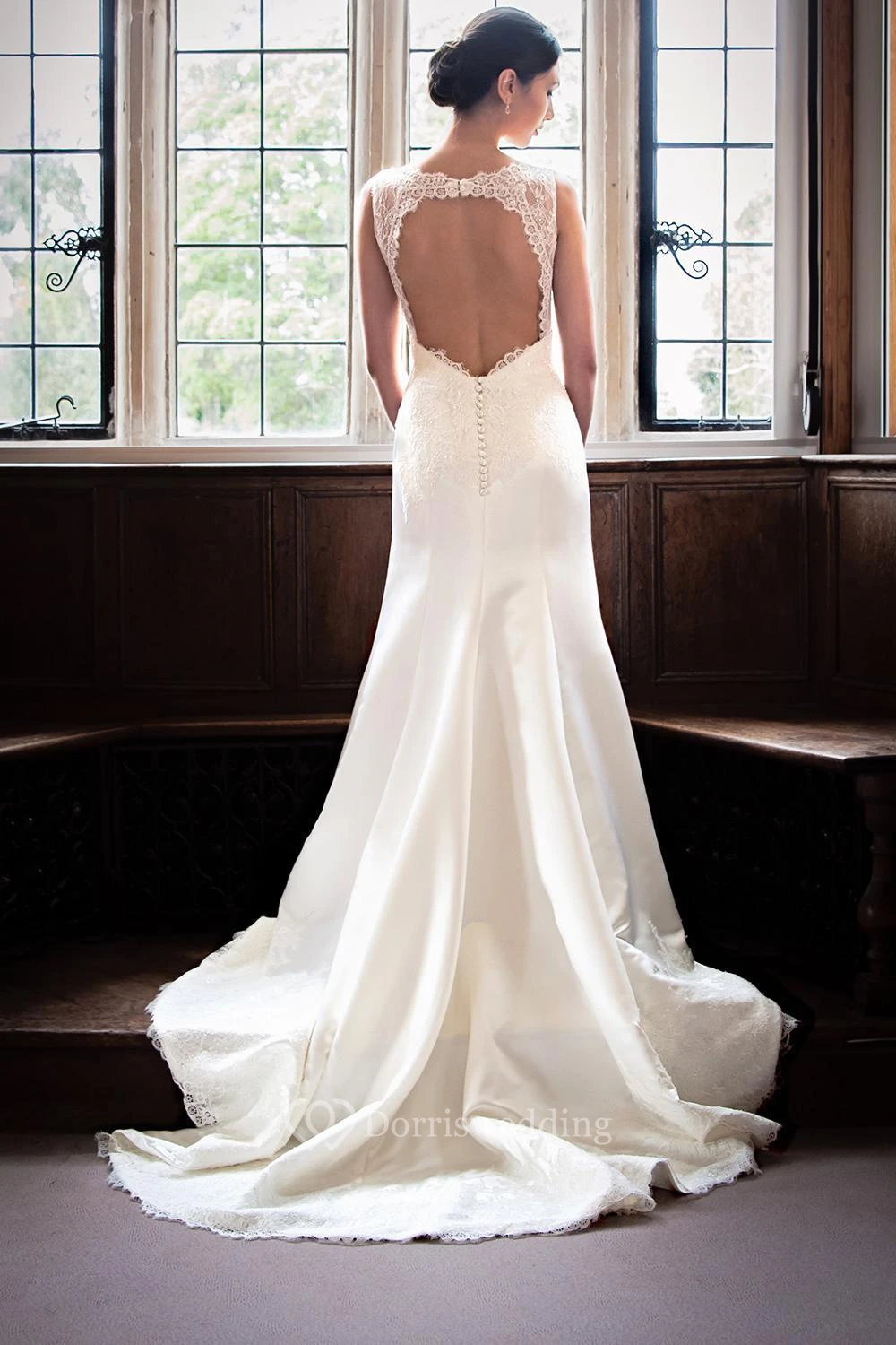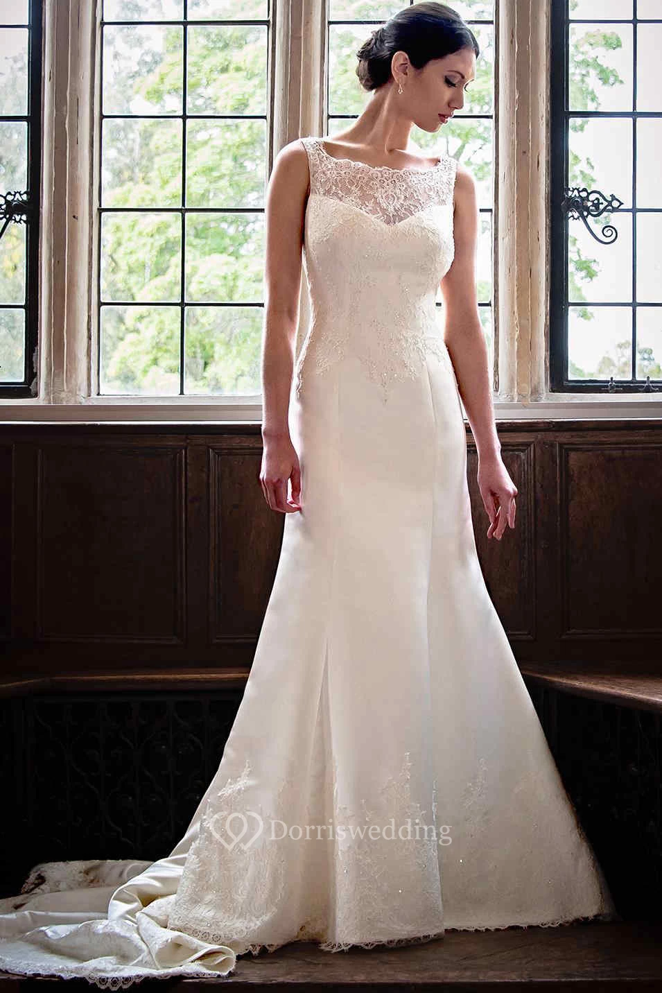 Sheath Long Sleeveless Bateau-Neck Appliqued Lace&Satin Wedding Dress With Beading