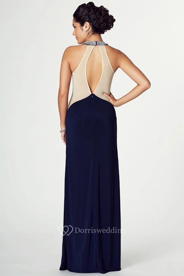 Sheath Long Sleeveless Beaded Scoop Chiffon Prom Dress With Illusion Back And Split Front