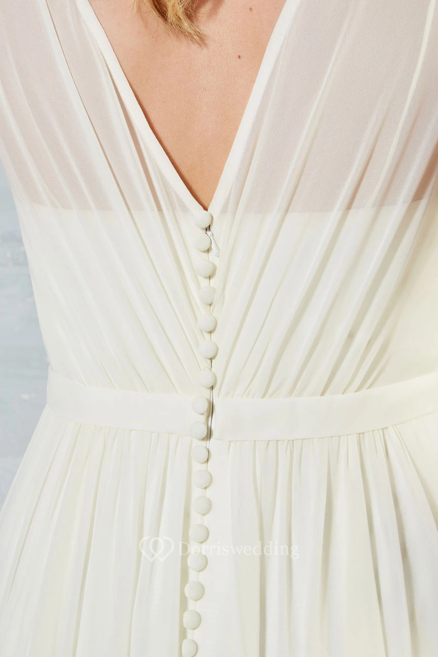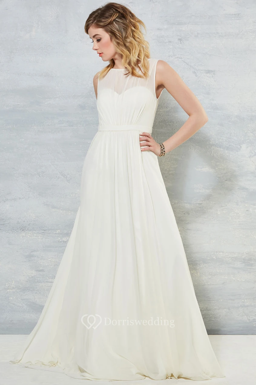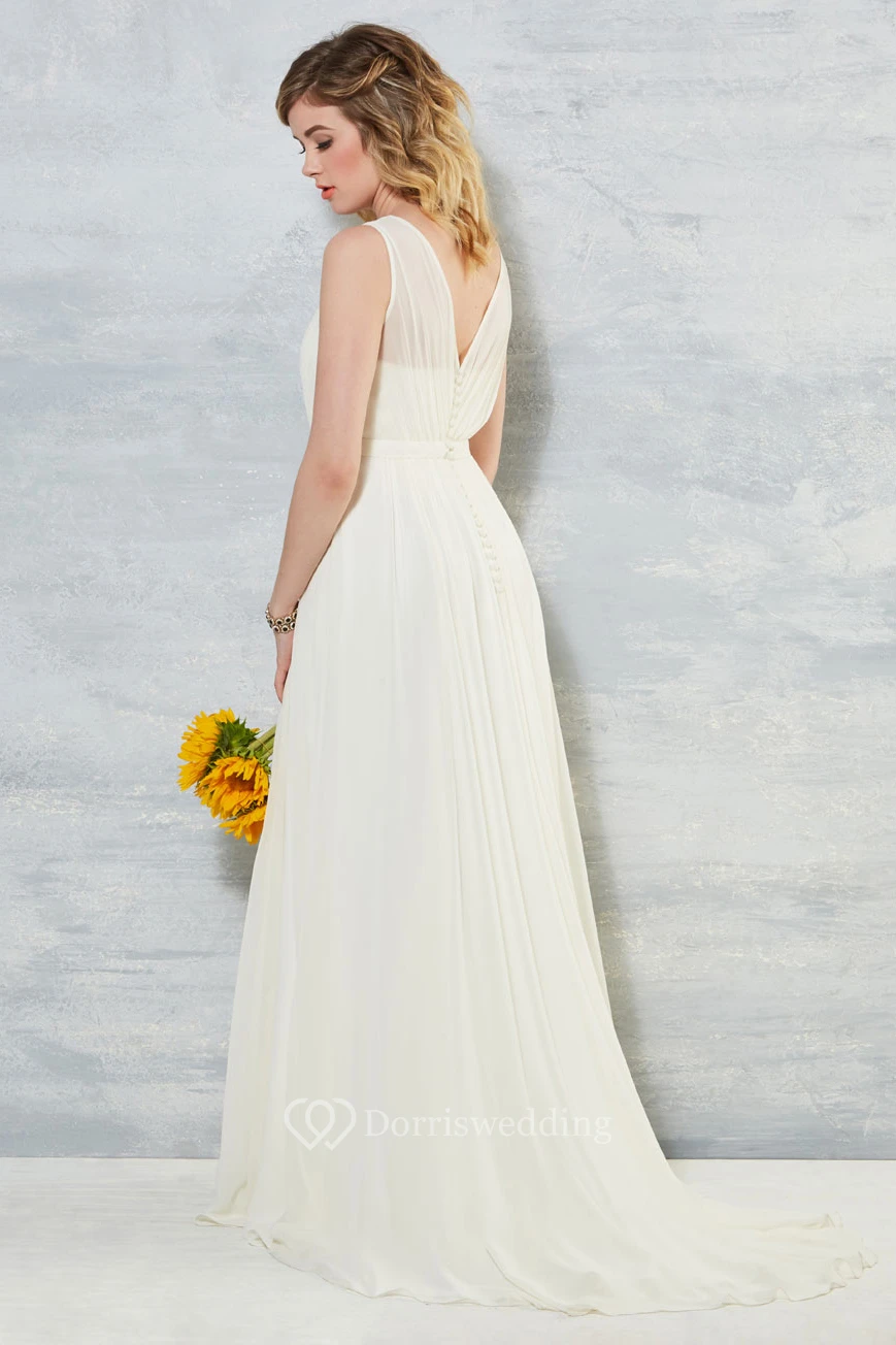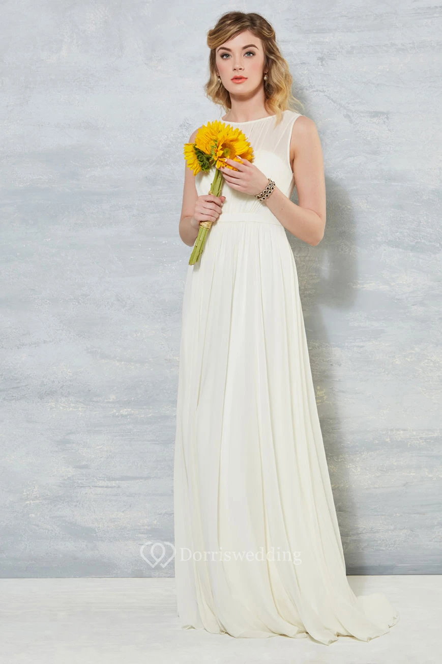 Sheath Long-Sleeveless High Neck Chiffon Wedding Dress With Ruching And V Back