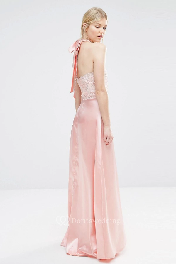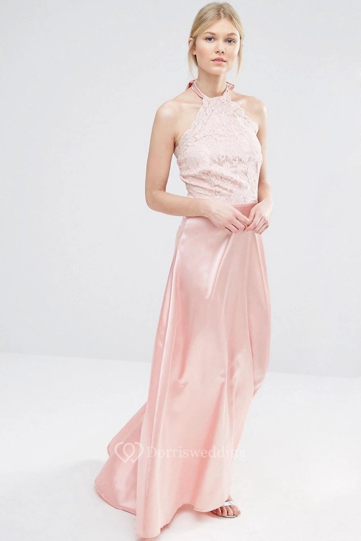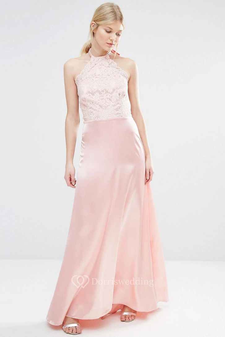 Sheath Long-Sleeveless High Neck Satin Bridesmaid Dress With Lace