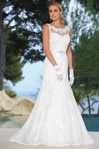 Sheath Long-Sleeveless Scoop-Neck Lace Wedding Dress With Appliques