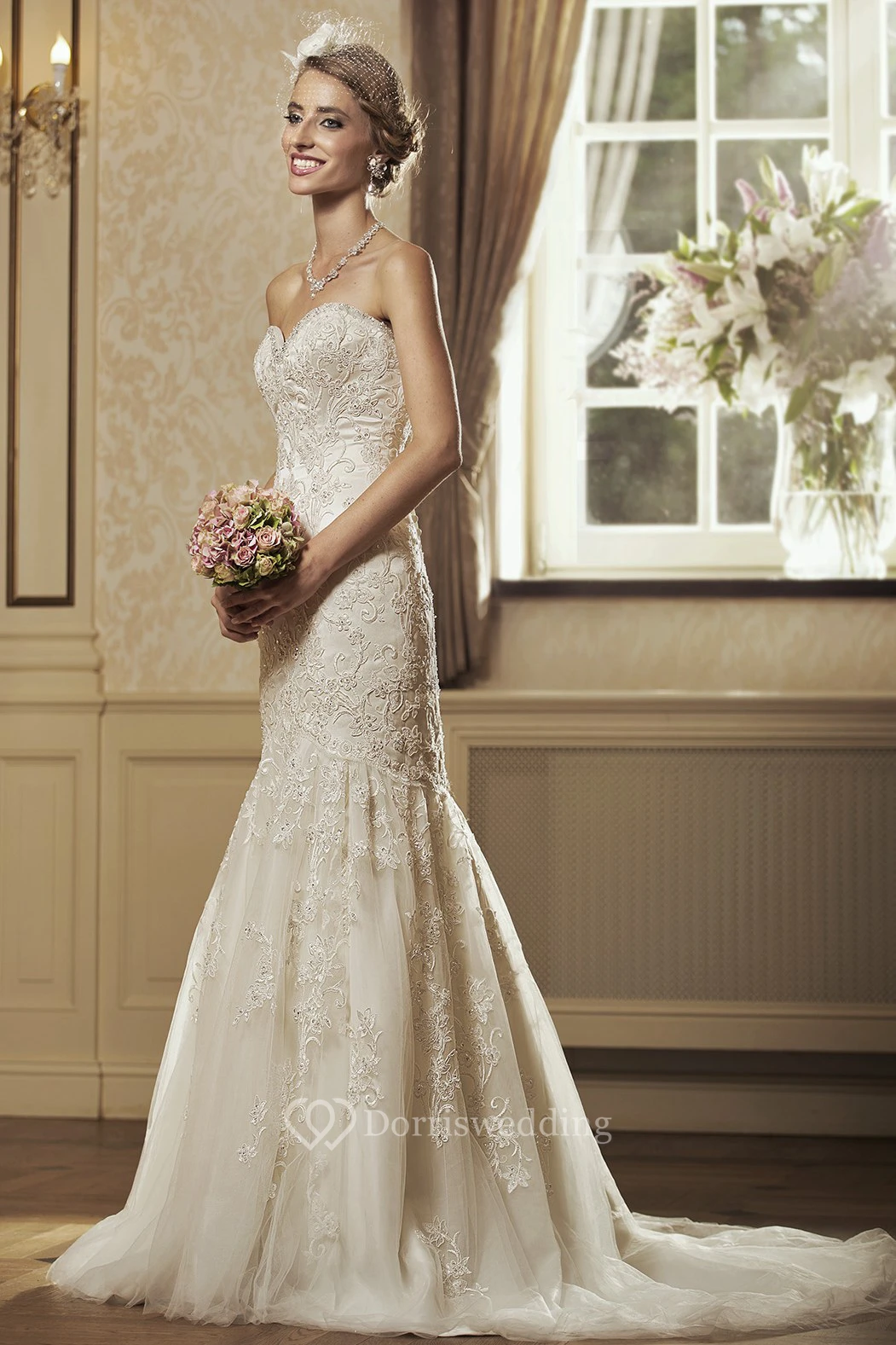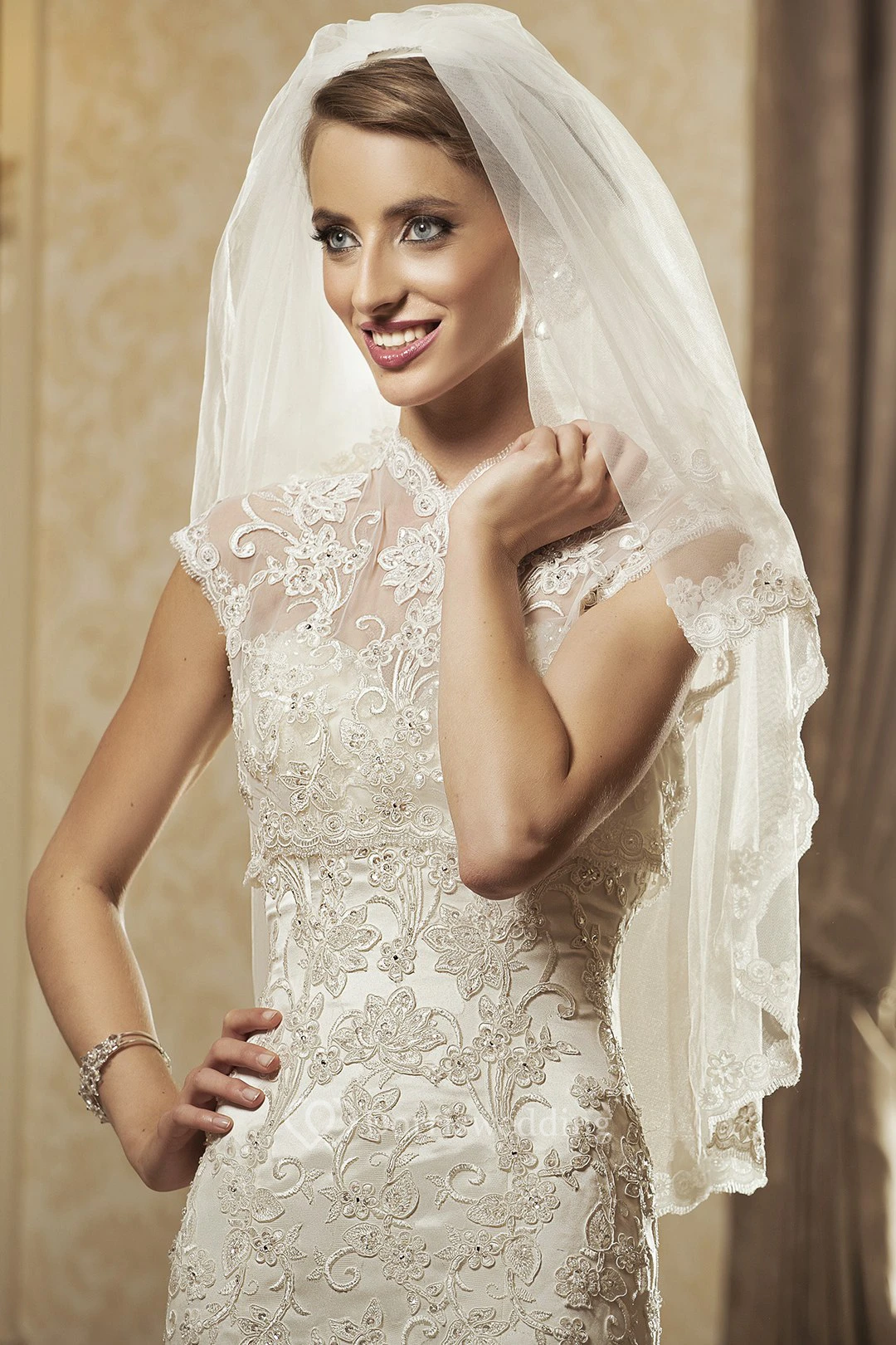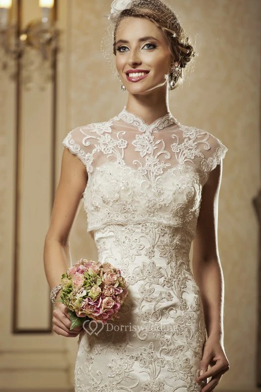 Sheath Long Sleeveless Sweetheart Appliqued Tulle&Lace Wedding Dress With Cape