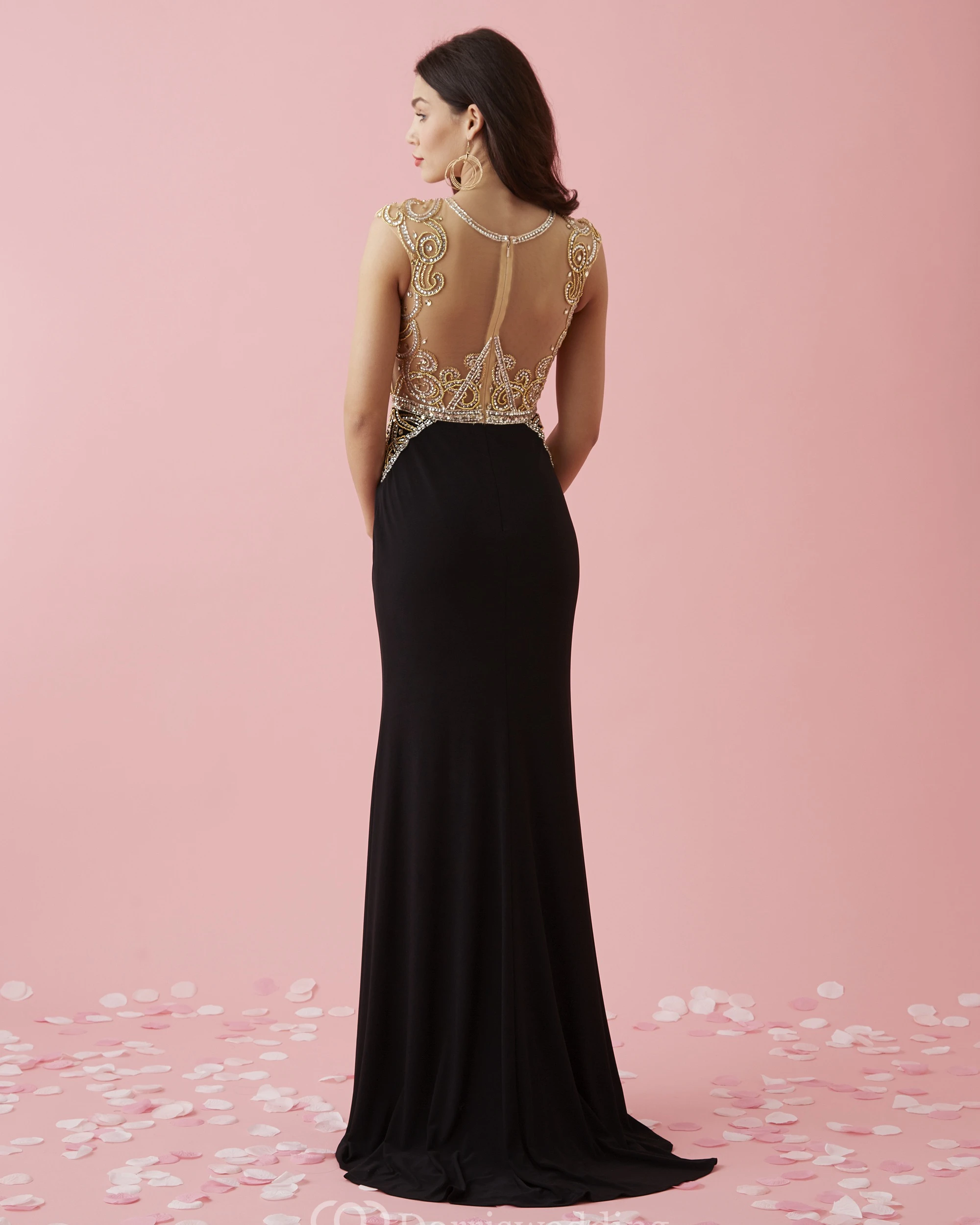 Sheath Long V-Neck Cap-Sleeve Jersey Illusion Dress With Beading