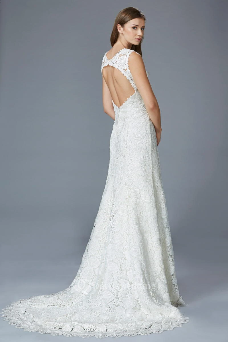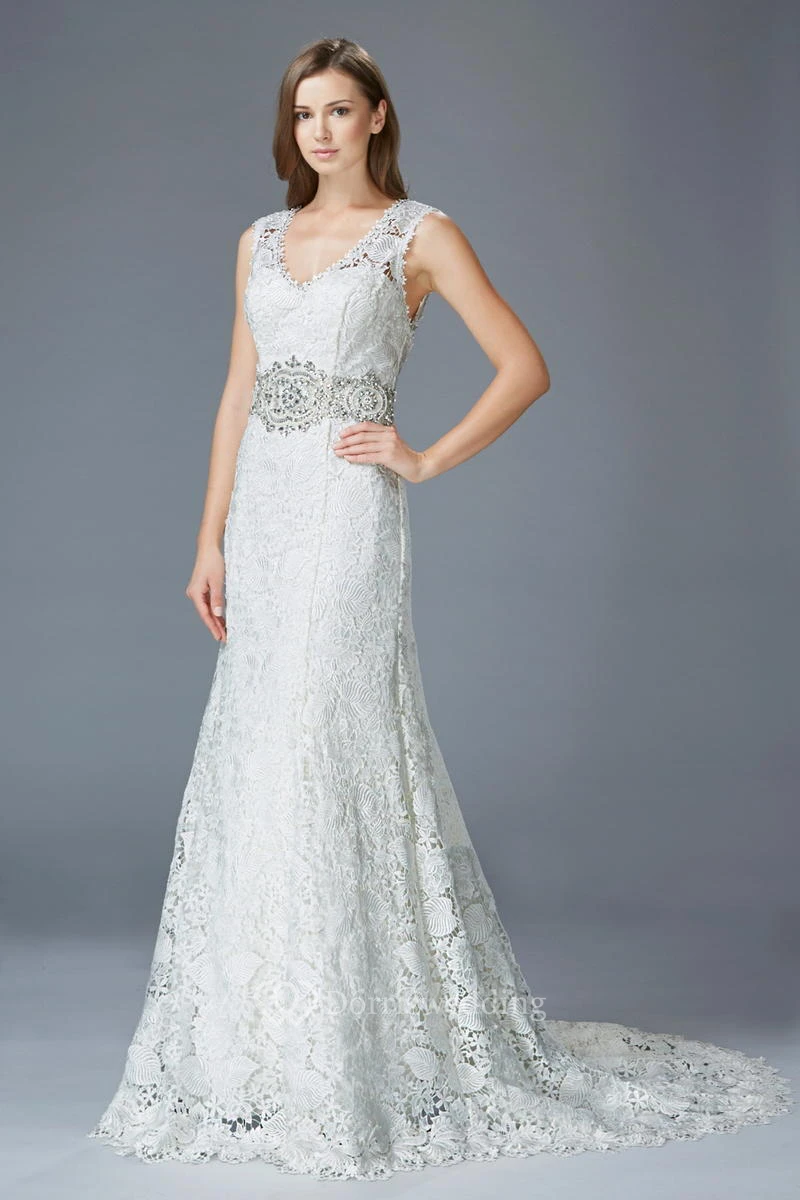 Sheath Long V-Neck Lace Court Train Keyhole Dress With Beading And Waist Jewellery