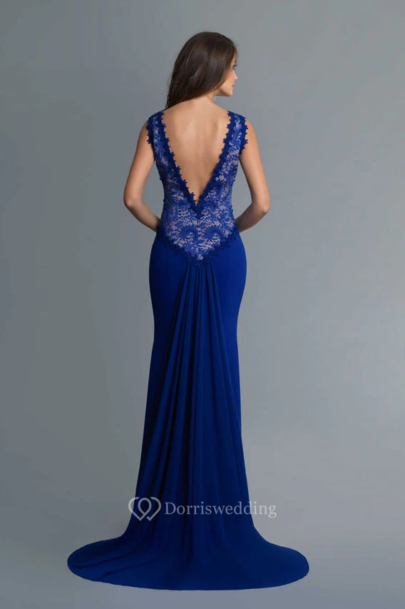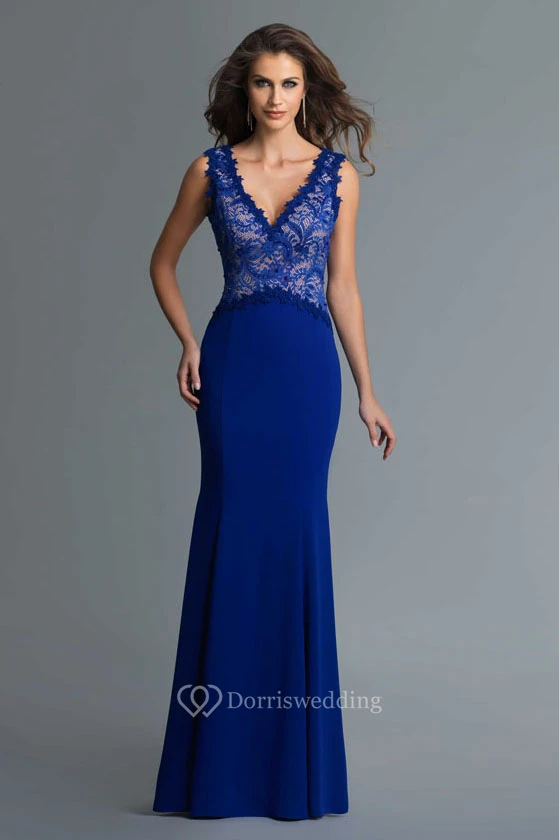 Sheath Long V-Neck Sleeveless Jersey Deep-V Back Dress With Lace