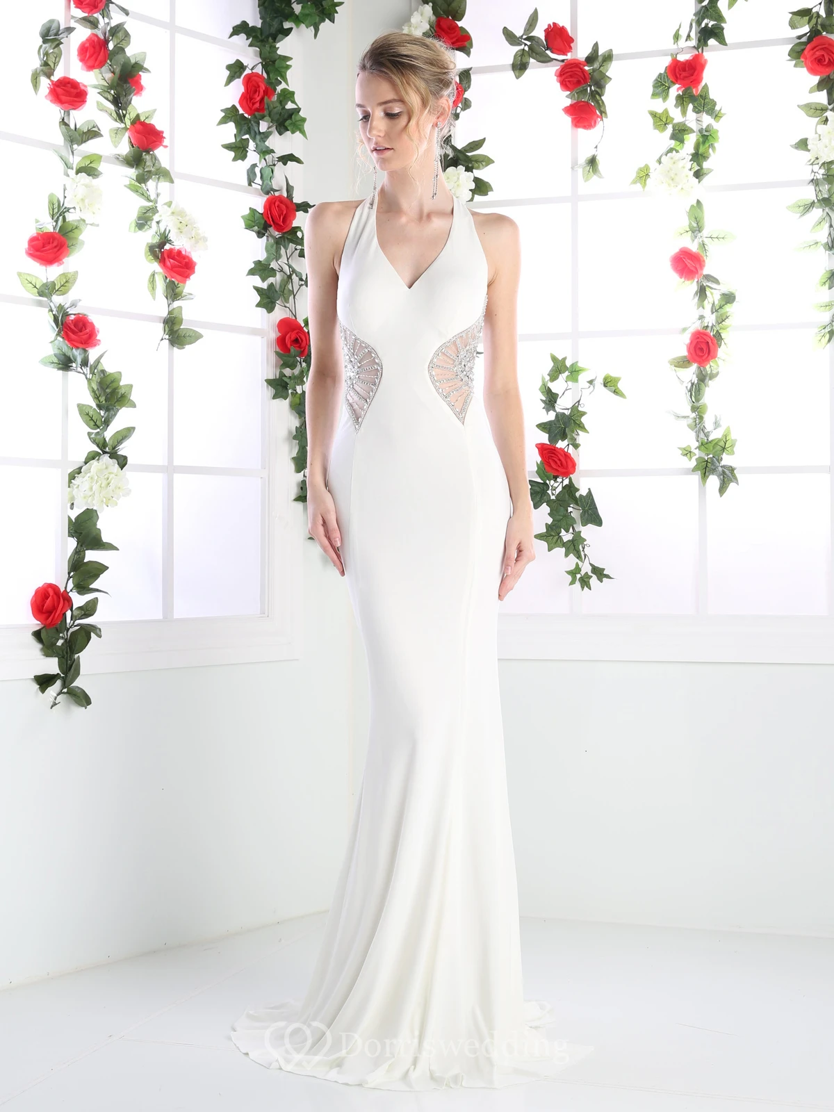 Sheath Long V-Neck Sleeveless Jersey Sweep Train Straps Dress With Beading