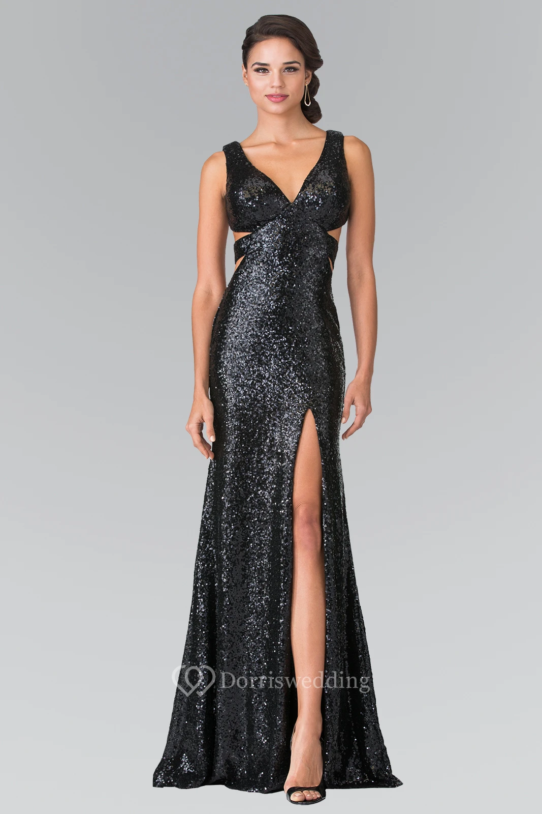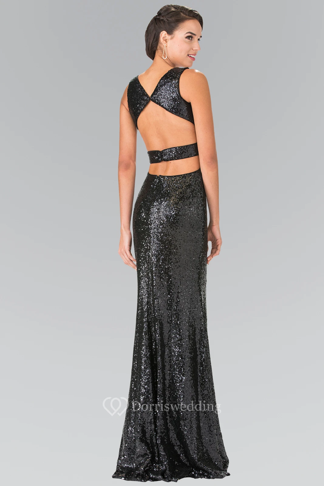 Sheath Long V-Neck Sleeveless Sequins Backless Dress With Split Front And Pleats