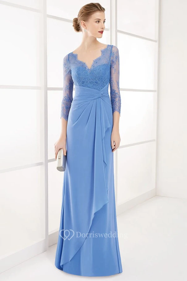 Sheath Maxi 3-4-Sleeve Lace V-Neck Chiffon Prom Dress With Draping