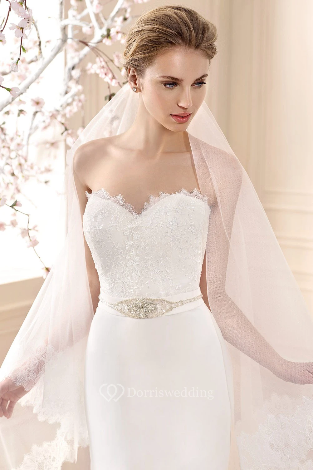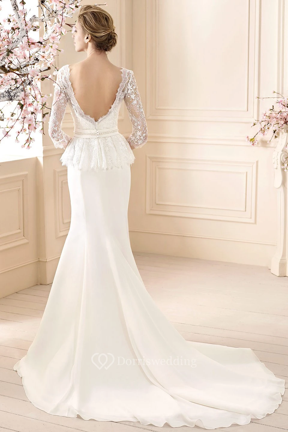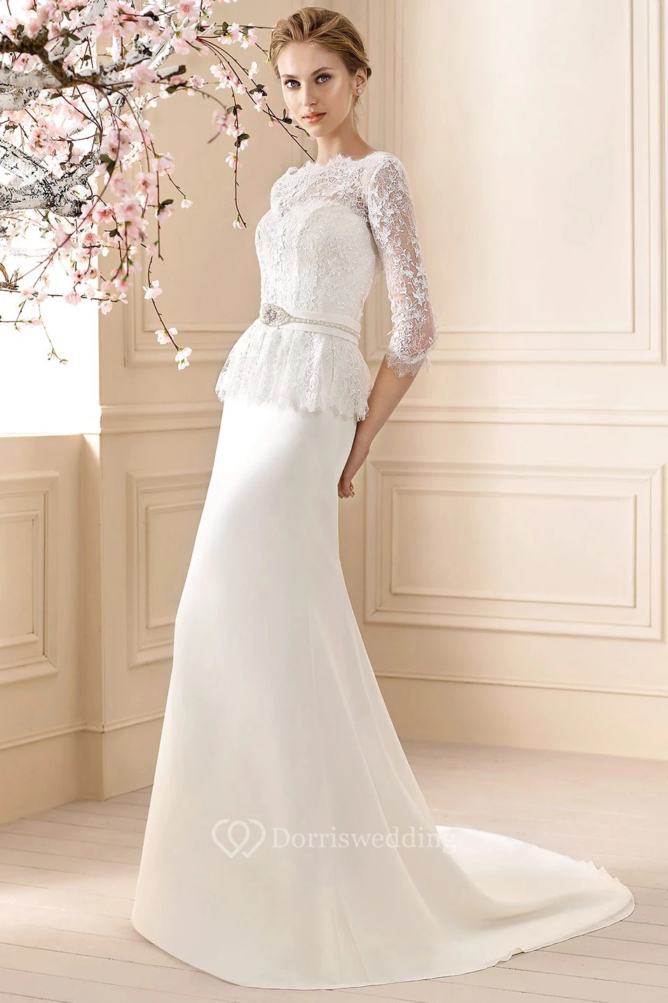 Sheath Maxi Appliqued 3-4-Sleeve Jewel-Neck Jersey&Lace Wedding Dress With Waist Jewellery
