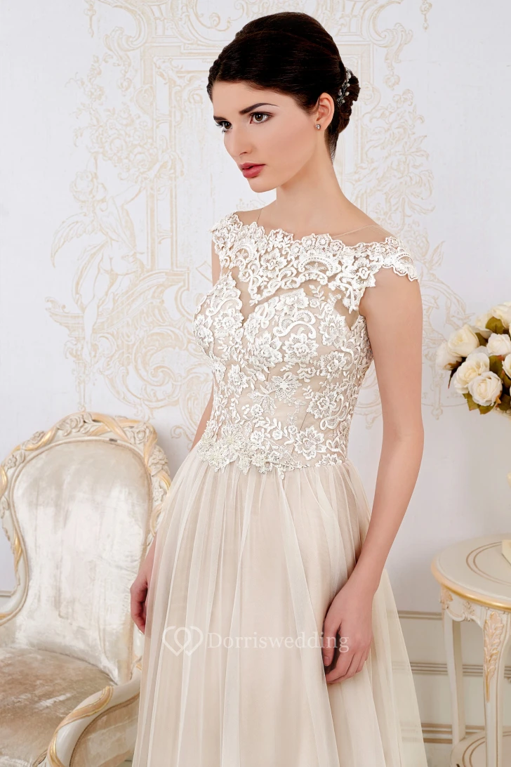Sheath Maxi Appliqued Cap-Sleeve Bateau-Neck Lace Wedding Dress
