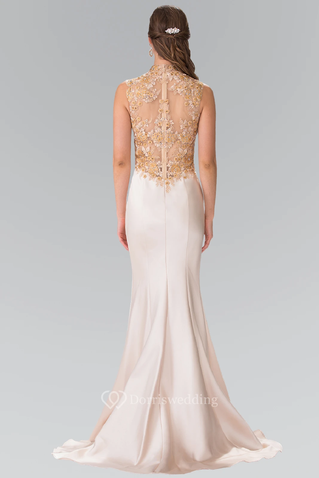 Sheath Maxi High Neck Sleeveless Satin Illusion Dress With Beading And Appliques