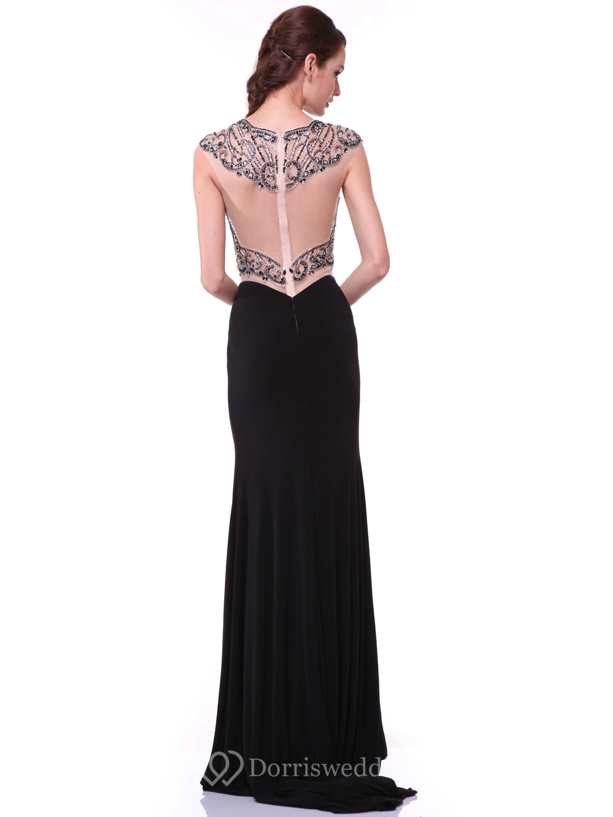 Sheath Maxi Jewel-Neck Cap-Sleeve Jersey Illusion Dress With Beading And Split Front