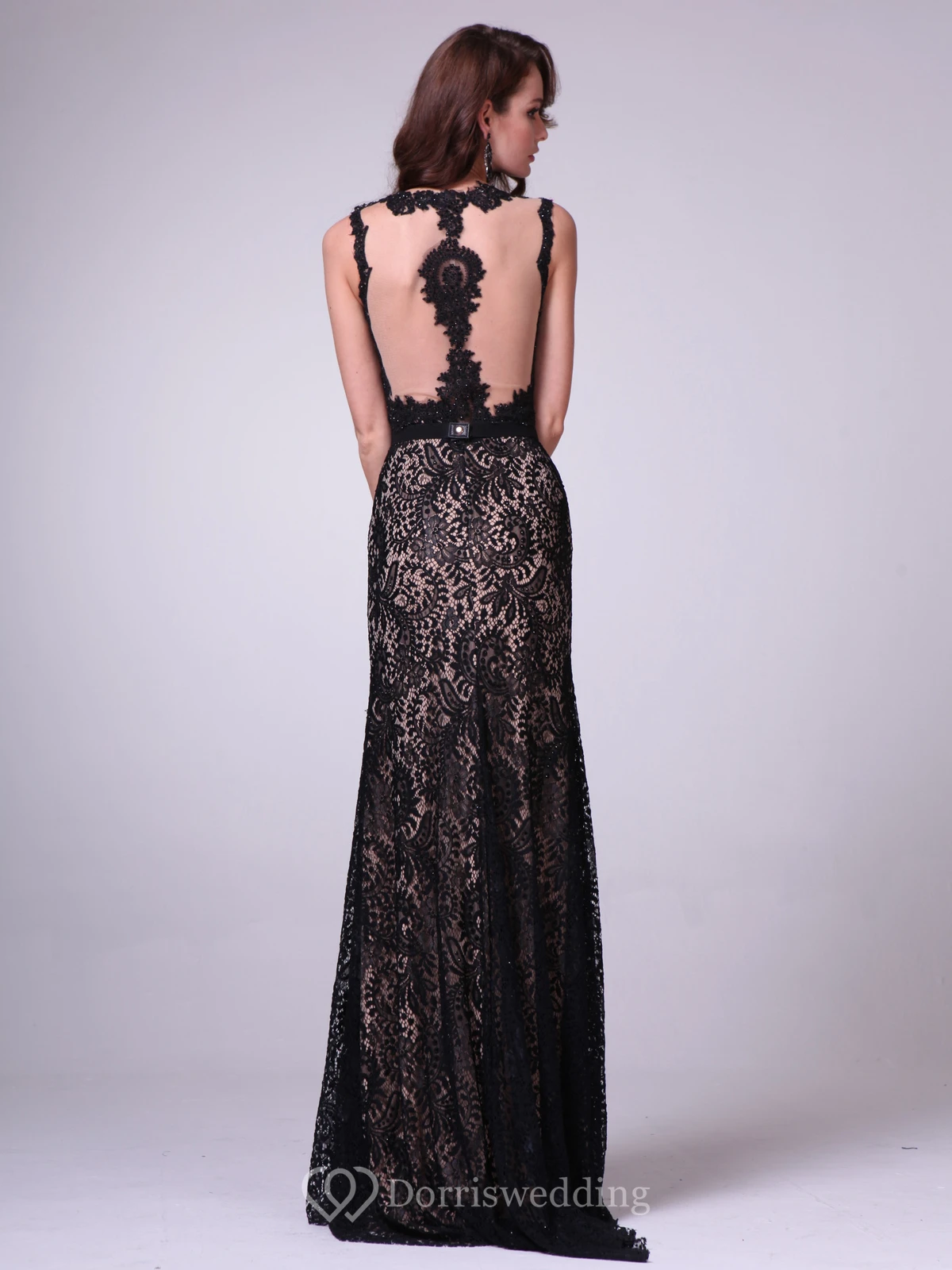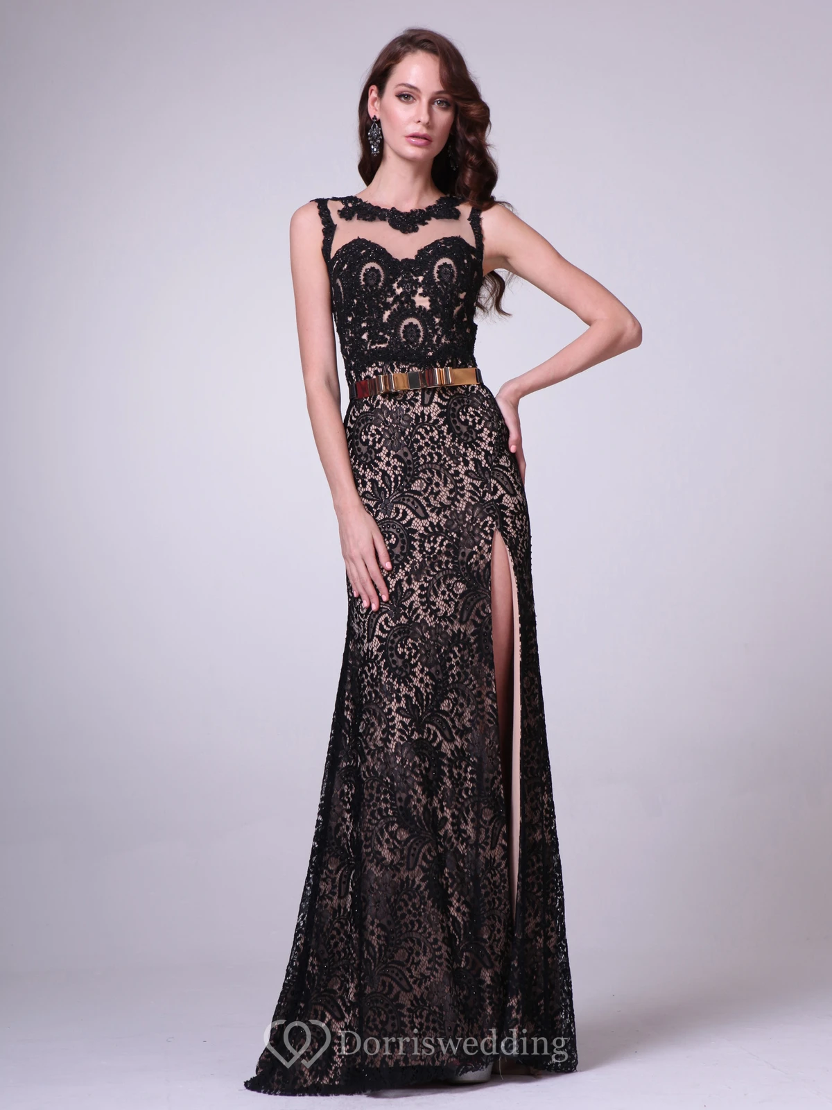 Sheath Maxi Jewel-Neck Sleeveless Lace Illusion Dress With Split Front