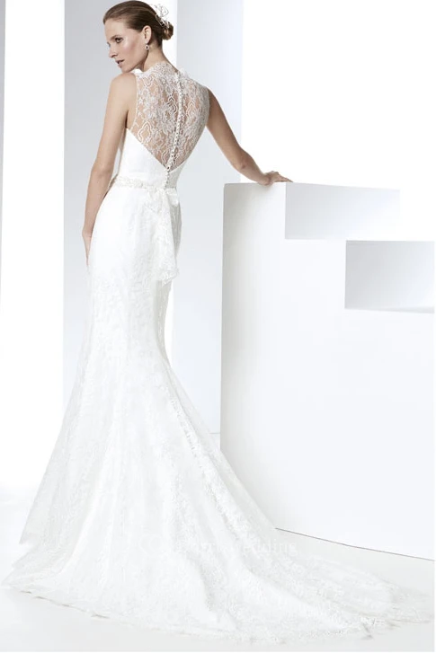 Sheath Maxi Jeweled Sleeveless Bateau Lace Wedding Dress With Illusion Back And Bow