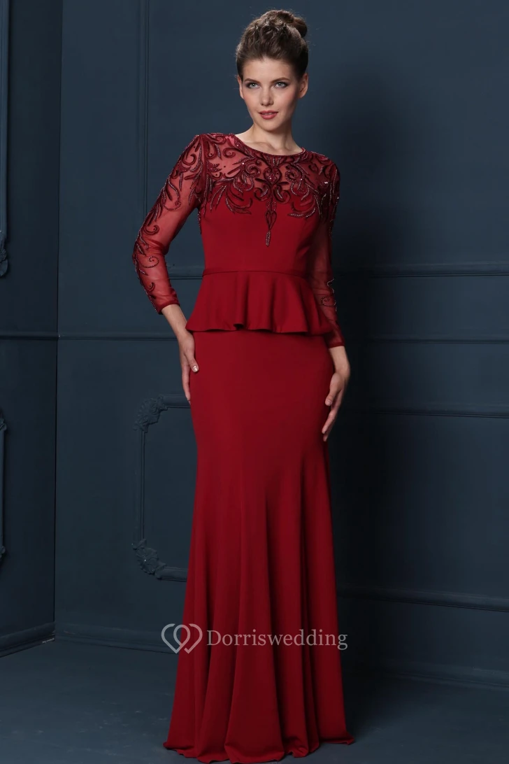 Sheath Maxi Long-Sleeve Beaded Scoop-Neck Jersey Mother Of The Bride Dress With Peplum