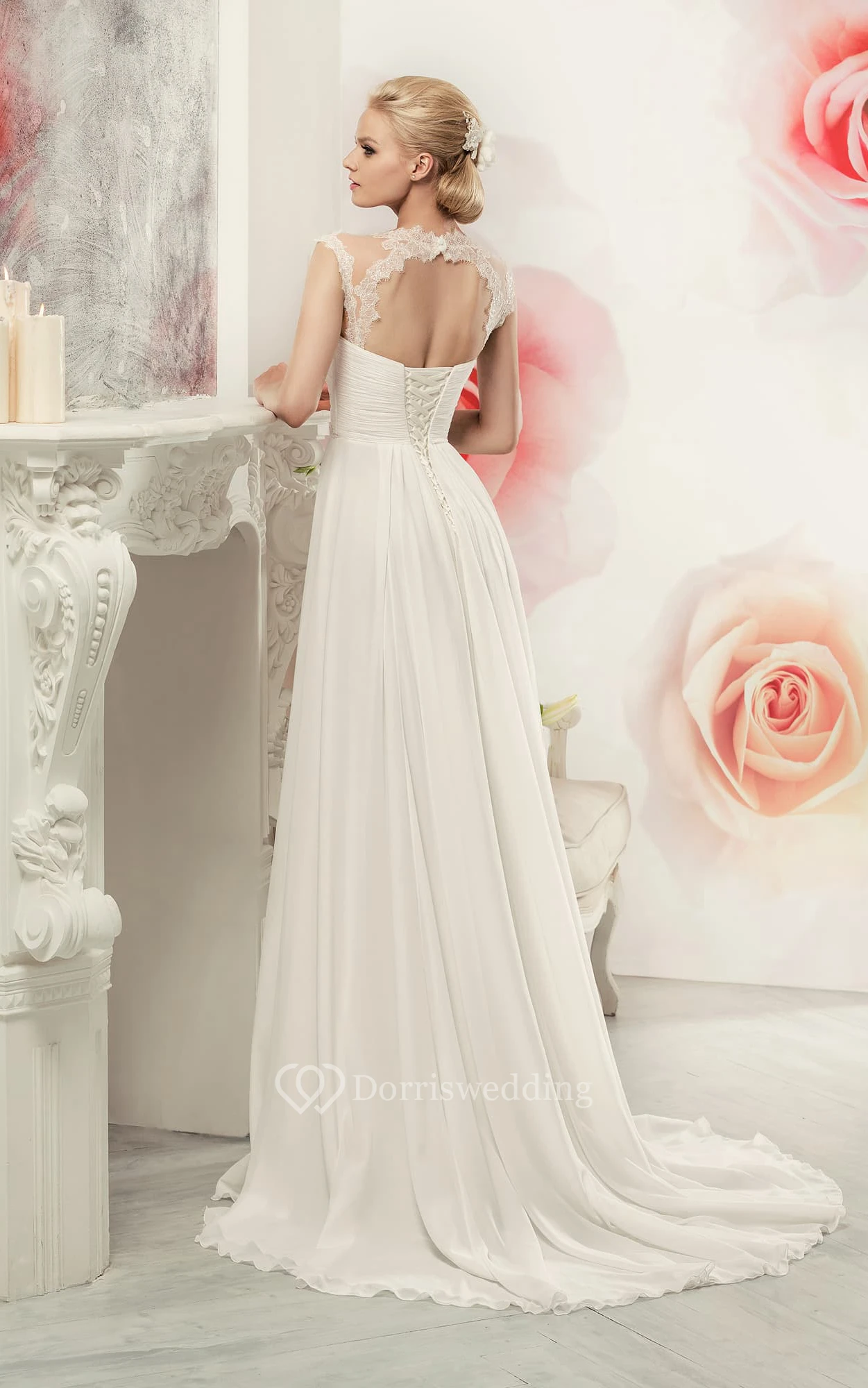 Sheath Maxi Queen-Anne Sleeveless Empire Keyhole Chiffon Dress With Criss Cross And Waist Jewellery