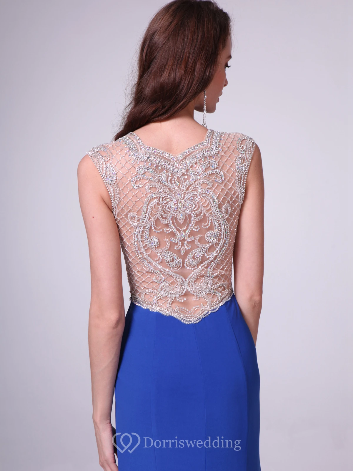 Sheath Maxi Scoop-Neck Jersey Illusion Dress With Split Front And Crystal Detailing