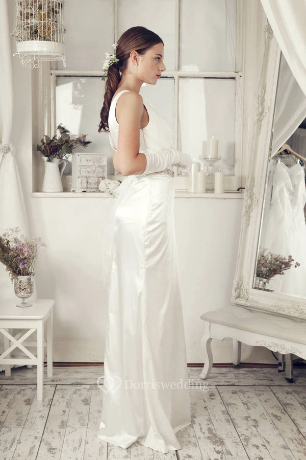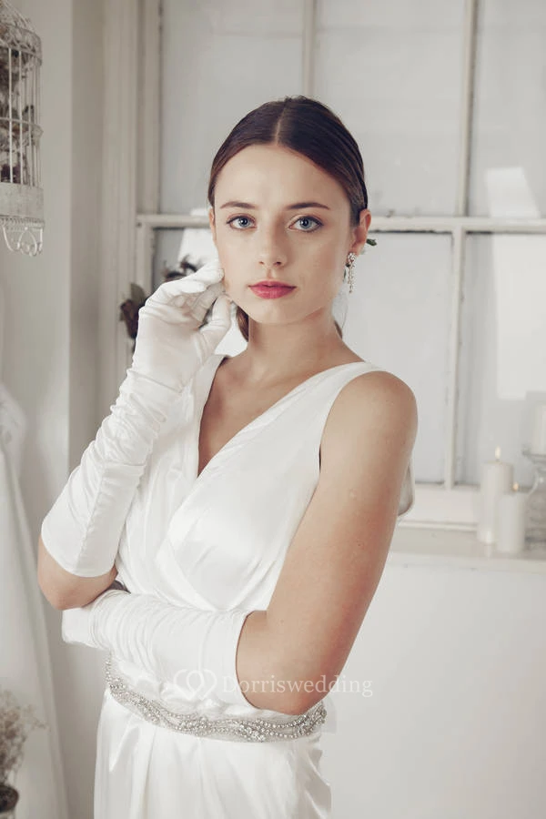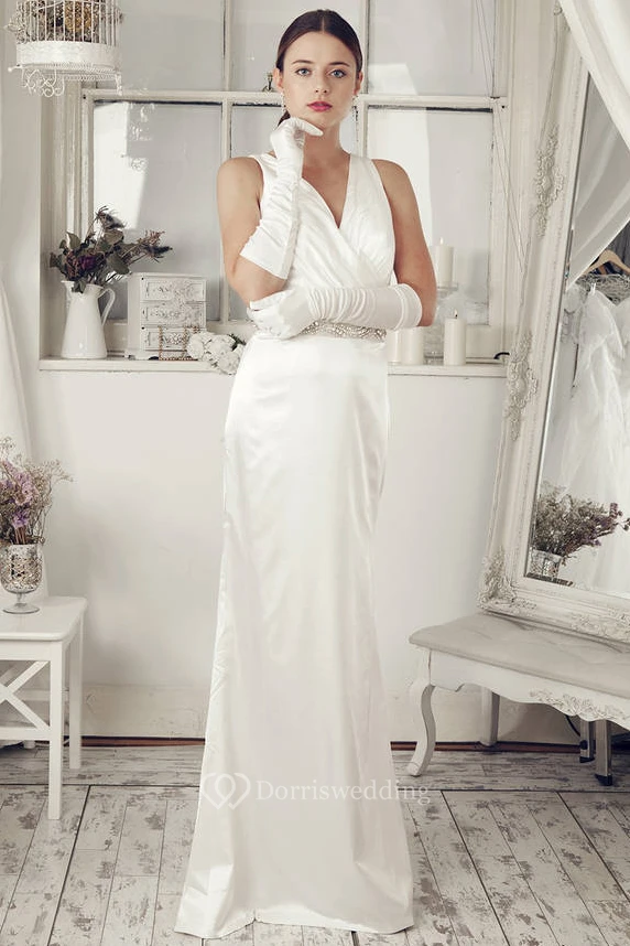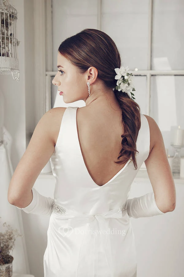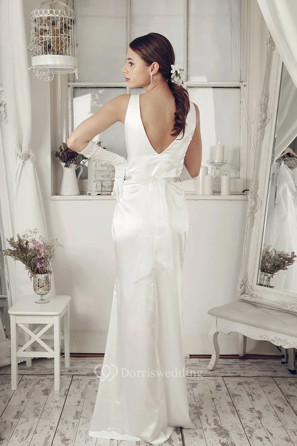 Sheath Maxi Sleeveless V-Neck Jeweled Satin Wedding Dress With Low-V Back And Bow