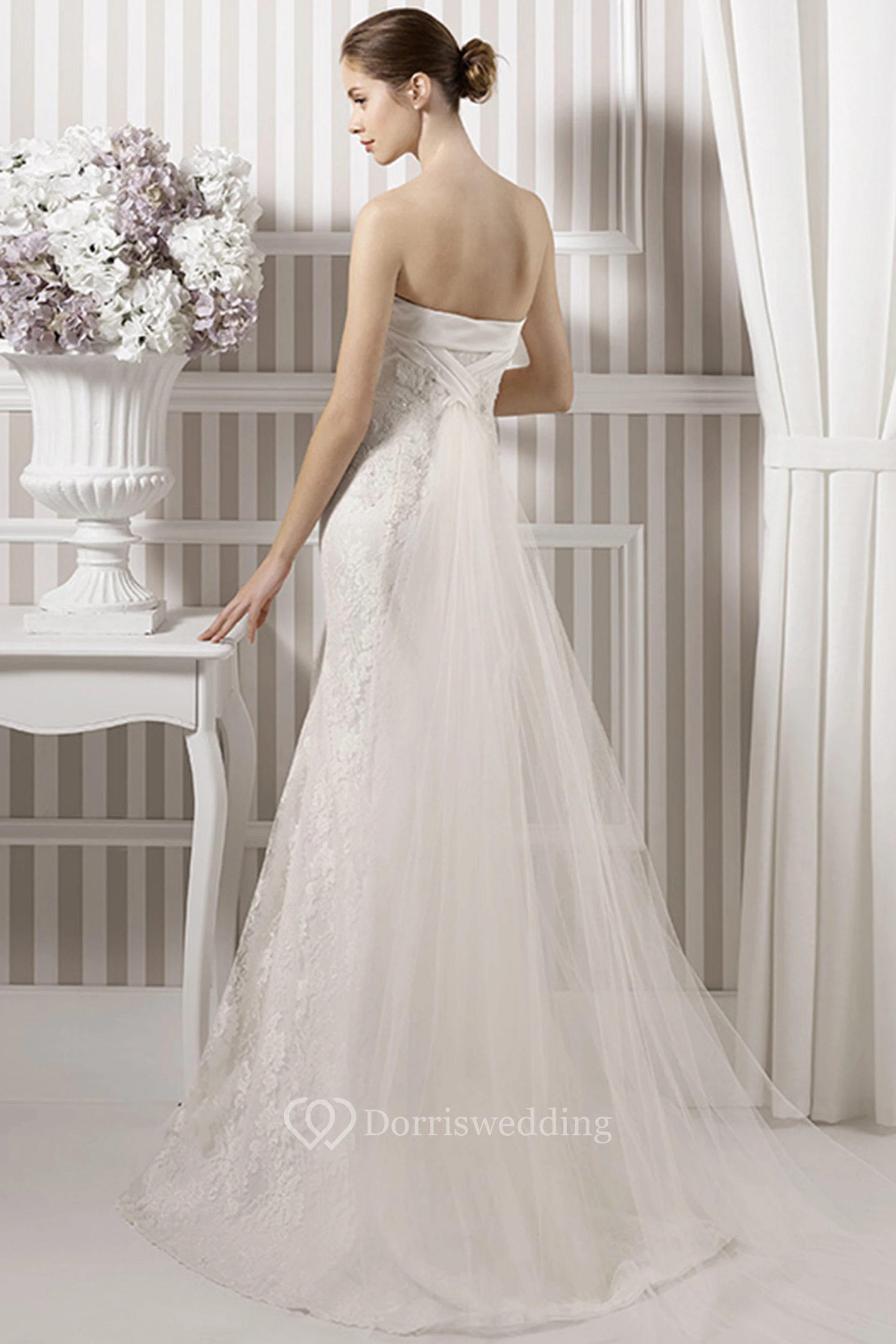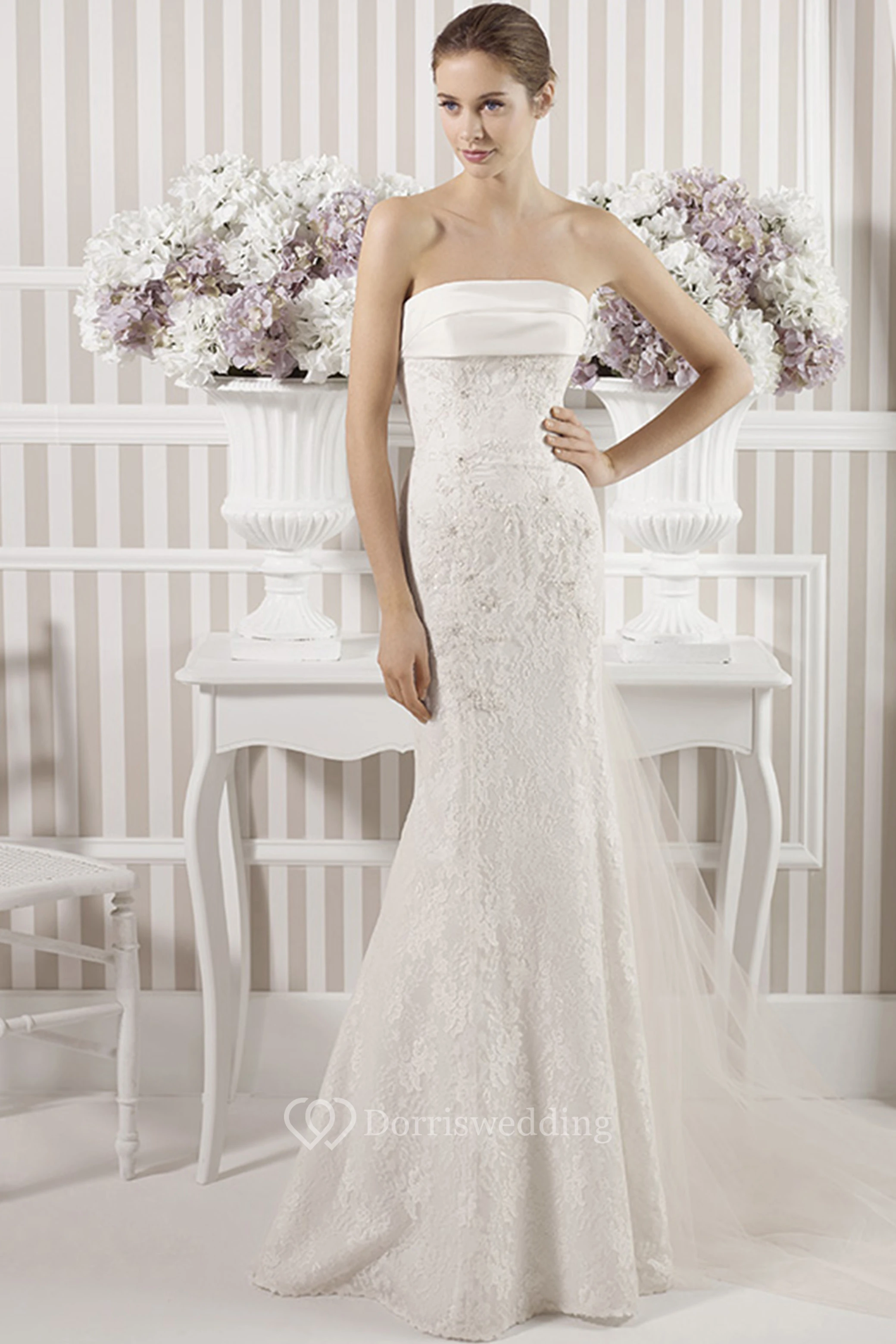 Sheath Maxi Strapless Appliqued Sleeveless Lace Wedding Dress With Sweep Train And Backless Style